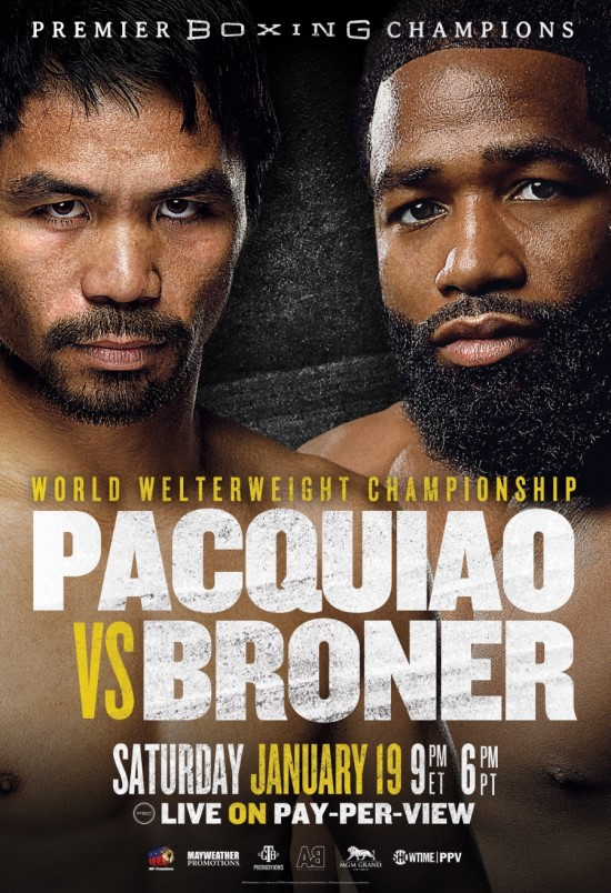 파퀴아오는 2017년 제프 혼(호주)에게 패한 뒤 지난해 7월 루카스 마티세를 KO로 물리치고 타이틀을 되찾아 60승2무7패의 전적을 기록하고 있다. 이에 맞서는 브로너도 최근 1무1패를 더해 33승1무3패다.