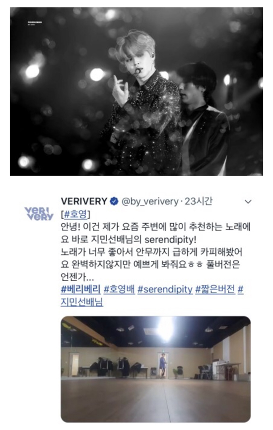 그룹 베리베리(VERIVERY)의 호영(배호영)이 공식계정에 방탄소년단(BTS) 지민의 솔로곡 '세렌디피티(Serendipity)' 안무 커버 영상을 올려 눈길을 끌고 있다.호영은 최근 "안녕! 이건 제가 요즘 주변에 많이 추천하는 노래에요 바로 지민선배님의 serendipity! 노래가 너무 좋아서 안무까지 급하게 카피해봤어요 완벽하지않지만 예쁘게 봐줘요ㅎㅎ 풀버전은 언젠가..."란 글도 함께 게재했다.세렌디피티'는 러브유어셀프 앨범 시리즈 중 '승허'의 인트로곡으로 지민 특유의 감성 깊은 보컬로 전세계에서 큰 사랑을 받아 뮤비가 BTS 솔로곡 뮤비 최초 8000만뷰 조회수를 돌파한 기록을 갖고 있다.또한 배우 정해인도 팬사인회에서 "요즘 되게 많이 듣는 노래거든요. 여러분 되게 좋아요. 많이 들어주세요."라며 세렌디피티를 최애곡으로 언급해 화제가 된 바 있다.