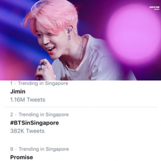 그룹 방탄소년단이 지난 19일 5만명이 운집한 싱가포르 내셔널 스타디움에서 열광의 콘서트를 성료한 가운데 이번에도 뜨거운 인기를 실감하게 만들었다.투어 국가마다 뜨거운 반응으로 트렌딩되어 '실트요정'이라 불리는 방탄소년단의 메인댄서이자 리드보컬인 지민이 이번에도 역시 싱가포르 실시간 트렌딩 1위를 기록 했다. 뿐만 아니라 투어국 이외의 나라 오스트리아, 일본, 알제리에서 'Jimin'이 트렌딩 1위를 차지하여 이쯤되면 '트렌딩 황제'가 아니냐는 하는 팬들의 반응이 이어지며 큰 화제가 댔다.또한 내셔널 스타디움에 싱가포르 팬들은 '우주가 처음 생겨 났을 때 부터 아미의 사랑 정해진 거였어"라 적힌 방탄소년단 지민의 '세렌디피티'의 가사를 슬로건에 담아 지민을 향한 뜨거운 사랑을 표현했다. 한편 방탄소년단은 2월 16,17일 야쿠오쿠 돔에서 러브유어셀프투어 일본 후쿠오카 콘서트를 이어간다.