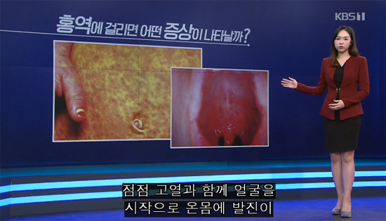대구, 경북에 이어 경기 시흥과 안산에서 잇따라 홍역 확진자가 나오면서 보건당국에 비상이 걸렸다.지금까지 대구 경북지역에서 발생한 홍역 환자는 16명으로 지난 11일에는 시흥에서 영유아 한 명이 홍역 진단을 받았다.안산에서도 20일 3명이 확진 판정을 받아 홍역환자가 8명으로 늘어났다.한편 홍역은 홍역 바이러스에 의한 감염으로 발생하며 전염성이 강하여 감수성 있는 접촉자의 90% 이상이 발병한다. 발열, 콧물, 결막염, 홍반성 반점, 구진이 복합적으로 나타나며 질병 특유의 점막진을 특징으로 한다. 한번 걸린 후 회복되면 평생 면역을 얻게 되어 다시는 걸리지 않는다.홍역 바이러스는 RNA 바이러스로 파라믹소 바이러스(Paramyxoviridae)과에 속하며 혈청 항원은 한 가지만 있다. 전구기와 발진기 동안 비인두 분비물이나 혈액, 소변에 바이러스가 존재한다.잠복기는 10~12일이며 전형적인 홍역은 전구기와 발진기로 나눌 수 있다.전구기는 전염력이 가장 강한 시기로 3~5일간 지속되며 발열, 기침, 콧물과 결막염 등의 증상이 나타난다. 결막염은 코플릭 반점(Koplik spot)이 출현하기 전에 나타나고 이어 1~2일만에 발진이 나타난다. 코플릭 반점은 진단적 가치가 있는 것으로, 첫째 아랫니 맞은 편 구강 점막에 충혈된 나타나는데, 작은 점막으로 둘러싸인 회백색의 모래알 크기의 작은 반점이며, 12~18시간 내에 소실된다.발진기는 코플릭 반점이 나타나고 1~2일 후에 시작하는데 홍반성 구진 형태의 발진이 목의 외상부, 귀 뒤, 이마의 머리선 및 뺨의 뒤쪽에서부터 생기며, 그 이후 첫 24시간 내에 얼굴, 목, 팔과 몸통 위쪽, 2일째에는 대퇴부, 3일째에는 발까지 퍼진다. 발진은 나타났던 순서대로 소실된다. 콧물, 발열, 기침은 점점 심해져 발진이 가장 심할 때 최고조에 달한다. 발진 출현 후 2~3일째 증상이 가장 심하고 이어 24~36시간 내에 열이 내리고 기침도 적어진다.발진은 병의 심한 정도에 따라 범위, 융합의 정도가 다르며 출혈반(범위가 넓은 반점모양 출혈), 광범위 익혈반(ecchymosis, 반상출혈, 피하출혈에 의하여 나타나는 점상출혈반)이 나타나는 경우도 있다. 발진이 소실되면서 갈색을 띠게 되고 작은 겨 껍질 모양으로 벗겨지면서 7~10일 내에 소실되는데 이 시기에 합병증이 잘 생긴다.그 밖에 경부 림프절 비대, 코 비대, 복통을 동반하는 장간막 림프절증, 맹장염 증상이 동반될 수 있으며, 영유아에서는 중이염, 기관지 폐렴, 설사 및 구토 등의 위장관 증상이 나타나기도 한다.사진 KBS 화면캡쳐