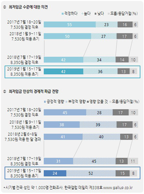 올해 최저임금은 작년 시간당 7,530원보다 820원 인상된 8,350원이다. 한국갤럽이 2019년 1월 15~17일 전국 성인 1,002명에게 올해 최저임금에 대해 물은 결과 42%가 '적정하다'고 평가했고 36%는 '높다', 13%는 '낮다'고 답했으며 8%는 의견을 유보했다.이는 작년 7월 최저임금위원회가 올해 최저임금을 8,350원으로 결정한 직후 조사 조사 결과와 비슷한 수준이다. 당시는 '적정' 42%, '높다' 36%, '낮다' 14%였다. 2018년 최저임금(7,530원) 적용 초기인 작년 1월과 비교하면 '적정' 의견이 8%포인트 줄고, '높다'가 9%포인트 늘었다.최저임금 8,350원이 '적정하다'는 의견은 20대(57%)와 진보층(52%)에서, '높다'는 의견은 자영업 직군(50%)과 보수층(50%)에서 상대적으로 많았다. ● 올해 최저임금 인상은 우리나라 경제에 '긍정적 영향' 24% vs '부정적 영향' 52%- 1년 전 최저임금(7,530원) 적용 초기 대비 낙관 14%포인트 줄고, 비관 13%포인트 늘어 최저임금 인상률이 2년 연속 두 자릿수를 기록하며 소비 확대, 내수 활성화 등 우리 경제에 도움이 될 것이란 기대와 함께 물가 상승, 중소 상공인 부담 가중 등에 대한 우려가 지속적으로 제기되어 왔다. 2019년 최저임금 적용 2주일 시점 기준 성인 24%는 올해 최저임금 인상이 우리나라 경제에 '긍정적 영향을 줄 것'으로 전망했고 52%는 '부정적 영향을 줄 것'이라고 답했다. 15%는 '영향 없을 것', 8%는 의견을 유보했다.작년 7월 최저임금위원회가 올해 최저임금을 8,350원으로 결정한 직후 조사에서는 우리나라 경제에 '긍정적 영향'을 줄 것이란 응답이 31%, '부정적 영향' 45%, '영향 없을 것' 13%였다. 최저임금 수준 적정성에 대한 생각에는 큰 변화 없지만, 6개월 전에 비해 경제적 파급 전망은 다소 비관적으로 바뀌었다고 볼 수 있다. 참고로 재작년인 2017년 7월 최저임금위원회가 2018년 최저임금을 7,530원으로 결정한 직후 조사에서는 우리 경제에 긍정적 영향을 줄 것이란 낙관론(45%)이 비관론(28%)을 앞섰지만, 실제 적용 초기인 작년 1월과 2월 조사에서는 낙관론과 비관론이 비슷해졌고 이후로는 비관론이 더 늘었다.올해 최저임금 인상의 경제적 파급 전망은 대부분의 응답자 특성에서 비관론이 우세하다. 여당 지지층을 비롯한 진보층, 올해 최저임금 수준이 적정하다고 평가한 사람, 올해 최저임금 인상이 본인에게 유리하다고 판단한 사람 중에서도 낙관론과 비관론 격차가 크지 않았다.● 올해 최저임금 인상은 나에게 '유리하다' 27% vs '불리하다' 31%- 직업별 차이: 20대 52%, 학생 57% '유리' vs 자영업자 58% '불리' 올해 최저임금 인상에 따른 본인 유불리를 물은 결과 '유리하다'가 27%, '불리하다'는 31%였고 39%는 '유리하지도 불리하지도 않다', 3%는 의견을 유보했다. '유리하다'는 응답은 20대(52%)와 학생(57%) 직군에서, '불리하다'는 자영업자(58%)에서 많았다. 6개월 전 최저임금 8,350원 결정 직후 조사에서도 '본인에게 유리하다'(24%)는 응답이 '불리하다'(27%)와 비슷했었다.직업별 유불리 인식 차이는 최저임금이 적용되는 일자리의 사용자인가 노동자인가에 따른 것으로 보인다. 업무 특성별 차이는 있겠지만, 일반적인 아르바이트나 시간제 일자리 상당수는 법정 최저임금 수준에 영향받는 것으로 추측된다.참고로 2017년 7월 18~20일 조사에서는 성인의 23%가 최근 1년 내 아르바이트나 시간제로 일한 적 있는 것으로 파악됐다. 그 비율을 직업별로 보면 학생에서 76%로 가장 높았고 그 다음으로는 블루칼라(판매·서비스직, 기능·숙련공, 일반작업직 등) 39% 순이며 연령별로는 20대 57%, 30·40대 10% 남짓, 50대 이상은 20% 내외였다.이번 조사 결과를 요약하면 성인 중 55%는 올해 최저임금 8,350원이 적정 또는 여전히 낮다고 평가하면서도 경제에 부정적 영향을 줄 것이라고 전망하는 사람 역시 52%에 달한다. 즉 최저임금 인상 방향에는 공감하지만, 그 속도와 방법에 우려가 적지 않다고 볼 수 있다. 이는 2년 연속 큰 폭으로 인상된 최저임금 적용 시 현장의 어려움, 최저임금 산입범위를 확대한 법 개정과 노동계 반발, 전반적인 경기 상황 등 여러 요인이 복합된 결과라 하겠다. 조사 개요- 조사기간: 2019년 1월 15~17일- 표본추출: 휴대전화 RDD 표본 프레임에서 무작위 추출(집전화 RDD 15% 포함)- 응답방식: 전화조사원 인터뷰- 조사대상: 전국 만 19세 이상 남녀 1,002명- 표본오차: ±3.1%포인트(95% 신뢰수준)- 응답률: 17%(총 통화 6,057명 중 1,002명 응답 완료)- 의뢰처: 한국갤럽 자체 조사