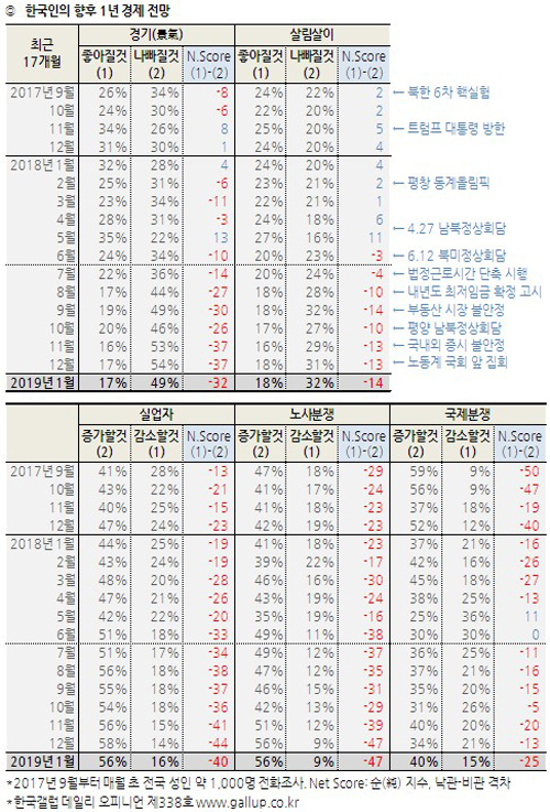 한국갤럽은 1979년부터 2018년까지 40년간 갤럽 인터내셔널(Gallup International) 다국가 비교 조사의 일환으로 경기, 살림살이, 실업자, 노사분쟁, 국제분쟁 전망을 추적해오고 있다. 이를 위해서는 매년 말 1회에 한해 전국(제주 제외) 성인 1,500명을 면접조사한다. 2017년 9월부터는 연간 12회(매월 1회) 전국 성인 1,000명 전화조사로 더 시의성 있는 자료를 제공한다. 이는 대통령 직무 평가, 정당 지지도 등 정치 지표와 함께 볼 수 있는 국내 유일 경제 지표다. 2018년부터는 경제 전망 조사 결과 교차집계표에 낙관 응답 비율에서 비관 응답 비율의 차이, 즉 Net Score(순(純) 지수)를 제시한다. 경제 전망 특성상 좋아지지도 나빠지지도 않을 것, 즉 현재와 향후 1년간 상황이 비슷할 것이란 응답이 많으므로 낙관·비관 어느 한 쪽의 응답만을 기준으로 판단하기 곤란할 수 있다.Net Score는 이를 단순화하여 조사 시기별, 응답자 특성별 차이를 보기 쉽게 한다. 양수(陽數)가 클수록 낙관론이, 음수(陰數)가 클수록 비관론이 우세하다고 볼 수 있으며 0에 가까울수록 낙관·비관 격차가 작음을 의미한다. ● '경기·살림살이·실업자·노사분쟁' 전망, 전반적으로 지난달과 비슷- '나빠질 것': 경기 11월 53% → 12월 54% → 1월 49%, 살림살이 29% → 31% → 32%- '증가할 것': 실업자 12월 58% → 1월 56%, 노사분쟁 56% → 56%, 국제분쟁 34% → 40%한국갤럽이 2019년 1월 15~17일 전국 성인 1,002명에게 향후 1년 우리나라 경기 전망을 물은 결과 17%가 '좋아질 것', 49%는 '나빠질 것', 29%는 '비슷할 것'으로 답했고 5%는 의견을 유보했다. 낙관 전망은 지난달과 동일하고 비관 전망은 5%포인트 줄었으나 8개월 연속 비관이 낙관을 앞서며, 격차 폭은 2017년 9월 조사 시작 이래 3개월 연속 최대 수준이다.살림살이에 대해서는 18%가 '좋아질 것', 32%가 '나빠질 것', 48%는 '비슷할 것'이라고 내다봐 살림살이 전망 순 지수(낙관-비관 격차, -14)도 8개월 연속 마이너스다. 2017년 9월 이후 경기·살림살이 전망이 가장 긍정적이었던 시기는 4.27 남북정상회담 직후인 2018년 5월이다.실업자가 향후 1년간 '증가할 것'이라고 보는 사람은 56%며 '감소할 것', '비슷할 것'이 각각 16%, 23%로 비관이 크게 앞선다. 문재인 대통령은 취임 후 일자리 우선 정책을 강조해왔지만, 실업자 증감 전망은 호전되지 않고 있다.향후 1년간 노사분쟁이 '증가할 것'이라는 의견은 56%로 지난달과 동일하며 이는 2017년 9월 조사 시작 이래 가장 비관적이다. 감소할 것'은 9%, '비슷할 것'은 25%다. 작년 하반기 이후 노사 관계 이슈로는 법정노동시간 단축, 최저임금, 대기업·중소기업 양극화, 협력이익 공유제 법제화 등이 있다. 민노총 등 노동계는 지난달 국회 앞에서 현 정부의 노동 관련 공약 후퇴 규탄, 탄력근로제 확대 철회, 비정규직 철폐 등을 요구하는 대규모 집회를 열었다.국제분쟁에 대해서는 40%가 '증가할 것', 15%가 '감소할 것'으로 전망해 지난달보다 다소 부정적으로 바뀌었다. 미중 무역 갈등, 미국 연방정부 셧다운 장기화가 세계 경제의 악재로 다뤄지고 있으며 국지적으로는 브렉시트 혼란, 한일 관계 악화 등이 자주 거론되고 있다. 조사 개요- 조사기간: 2019년 1월 15~17일- 표본추출: 휴대전화 RDD 표본 프레임에서 무작위 추출(집전화 RDD 15% 포함)- 응답방식: 전화조사원 인터뷰- 조사대상: 전국 만 19세 이상 남녀 1,002명- 표본오차: ±3.1%포인트(95% 신뢰수준)- 응답률: 17%(총 통화 6,057명 중 1,002명 응답 완료)- 의뢰처: 한국갤럽 자체 조사