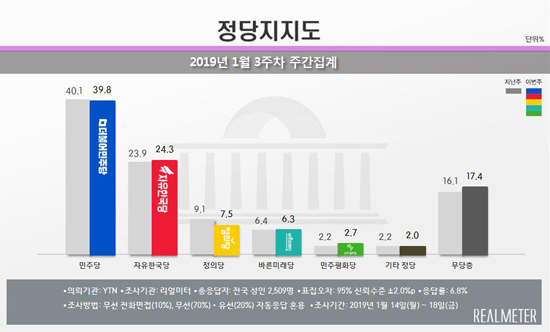 여론조사 전문기관 리얼미터(대표 이택수)가 YTN 의뢰로 1월 14일(월)부터 18(금)까지 닷새 동안 전국 19세 이상 유권자 37,041명에게 통화를 시도해 최종 2,509명(무선 80 : 유선 20)이 응답을 완료한 2019년 1월 3주차 주간집계 결과, 정당 지지도에서는 더불어민주당이 1주일 전 1월 2주차 주간집계 대비 0.3%p 내린 39.8%를 기록, 지난 2주 동안의 상승세가 멈춘 것으로 나타났다.민주당은 주중집계(월~수, 14~16일)에서는 40.7%로 3주째 상승세를 이어갔으나, 주 후반 손혜원 의원의 부동산 투기 의혹 논란과 서영교 의원의 재판 청탁 의혹이 크게 불거지면서 약세로 돌아선 것으로 나타났다.민주당은 충청권과 경기·인천, 20대와 40대, 노동직과 무직, 자영업, 진보층에서는 상승한 반면, 대구·경북과 호남, 부산·울산·경남, 30대와 50대, 학생과 가정주부에서는 하락했다.자유한국당은 0.4%p 오른 24.3%로 지난 2주 동안의 내림세를 마감한 것으로 조사됐는데, 주 초 황교안 전 총리의 한국당 입당이 지지율 오름세에 일부 영향을 미친 것으로 보인다. 한국당은 부산·울산·경남, 30대와 60대이상, 가정주부와 자영업, 학생, 중도층에서 오른 반면, 대구·경북, 20대와 50대, 노동직과 무직, 보수층에서는 내렸다.정의당은 1.6%p 하락한 7.5%로 11월 4주차(7.8%)이후 7주만에 다시 7%대로 내려갔고, 바른미래당은 0.1%p 소폭 내린 6.3%를 기록했다. 민주평화당은 0.5%p 오른 2.7%를 기록했다.이어 기타 정당이 0.2%p 소폭 내린 2.0%, 무당층(없음·잘모름)은 1.3%p 증가한 17.4%로 집계됐다.더불어민주당은 일간으로 1주일 전 금요일(11일) 일간집계에서 39.2%로 마감한 후, 14일(월)에는 42.4%로 올랐고, 15일(화)에는 41.1%로 내린 데 이어, 16일(수)에도 39.3%로 내렸고, 17일(목)에는 39.7%로 반등했으나, 손혜원 의원의‘부동산 투기 의혹 논란’ 서영교 의원의‘재판 청탁 의혹’이 크게 붉어졌던 18일(금)에는 38.5%로 다시 하락하며, 1월 3주차 최종 주간집계는 1주일 전 1월 2주차 주간집계 대비 0.3%p 내린 39.8%로 마감됐다.주간집계로는 지역별로 대구·경북(▼6.3%p, 36.4%→30.1%), 광주·전라(▼3.4%p, 54.4%→51.0%), 부산·울산·경남(▼2.5%p, 34.8%→32.3%), 연령별로는 30대(▼7.5%p, 50.7%→43.2%), 50대(▼1.4%p, 38.4%→37.0%), 직업별로는 학생(▼2.9%p, 36.1%→33.2%), 가정주부(▼2.2%p, 39.1%→36.9%)에서 하락한 반면, 대전·세종·충청(▲4.8%p, 43.0%→47.8%)과 경기·인천(▲4.0%p, 39.9%→43.9%), 40대(▲3.8%p, 45.4%→49.2%)와 20대(▲2.5%p, 38.6%→41.1%), 노동직(▲7.7%p, 35.0%→42.7%)과 무직(▲3.3%p, 32.9%→36.2%), 자영업(▲1.3%p, 32.2%→33.5%), 진보층(▲1.4%p, 59.9%→61.3%)에서 상승했다.