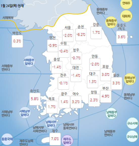 목요일인 1월 24일 오전 10시 현재, 전국이 맑은 날씨를 보이고 있는 가운데 오늘(24일)은 중국 북부에서 확장하는 고기압의 영향으로 전국이 대체로 맑겠다.내일(25일)은 중국 북부에서 확장하는 고기압의 영향으로 전국이 대체로 맑겠으나, 전라도와 제주도는 찬공기(1.5km 상공 약 -8~ -6도)가 약 7~9도의 해수면을 지나면서 온도차에 의해 만들어진 구름대의 영향으로 구름많고 전라서해안은 오후부터 밤사이(15시~24시)에, 제주도는 오후(15시)부터 모레(26일) 새벽(06시) 사이에 눈이 날리는 곳이 있겠다. 강원중남부해안과 경북북부해안에는 동풍의 영향으로 밤(21시)부터 구름많고 눈이 조금 오는 곳이 있겠다. 오늘과 내일 미세먼지 농도는 대기 확산이 원활해 전국 대부분 지역에서'보통'이나 '좋음' 수준을 보일 것으로 예상된다.모레(26일)는 중국 북부에서 중국 중부로 남하하는 고기압의 영향으로 전국이 대체로 맑겠으나, 전라도는 구름많다가 맑아지겠고, 제주도는 구름많겠다. 강원중남부해안과 경북북부해안은 동풍의 영향으로 새벽(03시)까지 구름많고 눈이 조금 오는 곳이 있겠다. < 기온 현황과 전망 >오전 4시 현재, 일부 강원영서에 한파특보가 발효 중인 가운데 영하 10도 이하의 기온 분포를 보이고 있고, 내일(25일)과 모레(26일) 아침 기온도 영하 10도 내외로 떨어져 추위가 이어지겠다. 모레(26일) 아침에는 바람도 강하게(9~14m/s, 32~50km/h) 불어 체감온도(철원 기준 영하 19도)는 더욱 낮아 매우 춥겠으니, 건강 및 농축수산물 관리, 수도관 동파 예방 등 시설물 관리에 유의해야 한다.< 강풍, 건조 현황과 전망 >대부분의 강원도와 경상도, 전남(광양)에는 건조특보가 발효 중인 가운데, 대기가 매우 건조(실효습도 20~35%)하겠고, 그 밖의 지역에서도 대기가 차차 건조해지겠다.특히, 내일과 모레 해안과 산지에는 바람이 강하게(9~14m/s, 32~50km/h) 불겠고, 내륙에서도 약간 강하게(4~9m/s, 14~32km/h) 불어 화재 발생 시 큰 불로 이어질 수 있으니, 산불 등 각종 화재에 각별히 유의해야 한다.* 실효습도: 목재 등의 건조도를 나타내는 지수로 실효습도가 낮을수록 건조함을 의미함.< 해상 전망 >내일 오후(15시)에 서해먼바다와 동해먼바다에서 바람이 강해지고, 물결이 높아지기 시작해 모레(26일)는 일부 남해앞바다를 제외한 전해상에 바람이 강하게(9~14m/s, 32~50km/h) 불고, 물결이 매우 높게(3~4m) 일겠으니, 항해나 조업하는 선박은 각별한 유의가 필요하다. 기상청은 내일(25일) 늦은 오후(15시 이후)에 서해먼바다와 동해먼바다부터 풍랑특보가 발표되어 그 밖의 해상으로 차차 확대될 가능성이 높으니, 앞으로 발표되는 기상정보와 기상특보를 참고하라고 당부했다.동해안에는 오늘부터 글피(27일)까지 너울로 인해 높은 물결이 해안도로나 방파제를 넘는 곳이 있겠으니 해안가 안전사고에 유의해야 한다. 내일(25일)까지 천문조에 의해 바닷물의 높이가 높은 기간이니, 서해안과 남해안 저지대에서는 만조 시 침수 피해가 없도록 유의해야 한다. * 예상 적설/강수량- 25일 아침(09시 이후)부터 26일 밤(21시)까지 울릉도.독도: 5~15cm/5~20mm - 25일 밤(21시 이후)부터 26일 새벽(03시)까지 강원중남부해안, 경북북부해안, 제주도산지 1~3cm/5mm 미만 *지역별 날씨-경기24일 경기도는 중국 북부에서 위치한 고기압의 영향으로 대체로 맑겠다.기상청에 따르면 이날 아침 최저기온은 -11~-4도, 낮 최고기온은 3~6도다.시·군별 예상 기온은 수원 -7~5도, 파주 -12~4도, 이천 -9~6도, 평택 -7~4도, 광명 -5~4도 등이다.경기 서해 앞바다의 물결은 0.5m로 일겠다. 미세먼지 농도는 '보통'으로 예보됐다.-부산 경남24일 부산·경남은 중국 북부에서 확장하는 고기압의 영향으로 대체로 맑겠다. 부산지방기상청에 따르면 이날 아침 최저기온은 부산 0도, 창원 영하 2도, 진주 영하 6도, 거창 영하 8도, 통영 0도로 전날보다 낮겠다.낮 최고기온은 부산 11도, 창원 9도, 진주 11도, 거창 10도, 통영 10도로 전날보다 조금 높겠다.미세먼지 농도는 부산과 경남 모두 '좋음' 수준으로 예보됐다.바다의 물결은 남해동부 앞바다에서 0.5~2m로, 먼바다에서 0.5~3m로 높게 일겠다.-인천24일 인천 지역은 중국 북부에서 확장하는 고기압의 영향으로 대체로 맑겠다.수도권기상청 인천기상대에 따르면 이날 아침 최저기온은 강화군·계양구·부평구·서구 -7도, 연수구·미추홀구·남동구 -6도, 중구 -5도, 동구 -4도, 옹진군 -1도를 기록하겠다.낮 최고기온은 강화군·부평구 4도, 중구·옹진군·중구·서구·연수구·계양구·미추홀구·남동구동구 3도로 예상됐다.바다의 물결은 0.5~1.0m로 일겠다. 미세먼지 농도는 보통 수준을 보이겠다.-대구 경북24일 대구와 경북지역은 맑은 가운데 내륙의 아침기온이 영하10도 안팎까지 내려가 추울 것으로 예상된다.대구기상지청에 따르면 중국 북부에서 확장하는 고기압의 영향을 받아 대체로 맑겠고, 울릉도와 독도는 구름이 많겠다.아침 최저기온은 김천 영하10도, 안동 영하7도, 대구 영하6도, 울진 영하4도, 포항 영하1도 등 영하11도~영하1도, 낮 최고기온은 포항 10도, 대구 9도, 울진 8도, 안동·김천 7도 등 6~10도로 전날보다 1~2도 가량 낮겠다.대기 확산이 원활해 미세먼지 