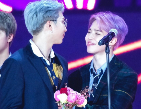 지난 2019서울가요대상에서 2년 연속 대상 수상한 방탄소년단이 수상소감 무대에서 보여준 리더 RM과 지민이 서로 따뜻한 눈빛을 주고 받는 사진이 최근 온라인 커뮤니티에 올려져 화제다.감동적으로 대상소감을 끝낸 리더 RM과 지민의 애틋한 포옹장면으로 RM이 감동적인 수상소감을 끝내자 뒤에있던 지민이 여러감정을 담은 눈빛으로 남준이를 바라보며 토닥토닥 해주고 남준이 바로 팔을뻗어 지민을 안듯이 어깨를 감싸준다.이 장면에서 팬들은 그 누구도 짐작도 할 수 없는 상호 무한신뢰와 애정을 엿볼수 있다하며 또한 이 두사람은 유독 서로 의지를 하는것이 느껴져서 뭔가 마음이 찡하다는 반응이 이어졌다.