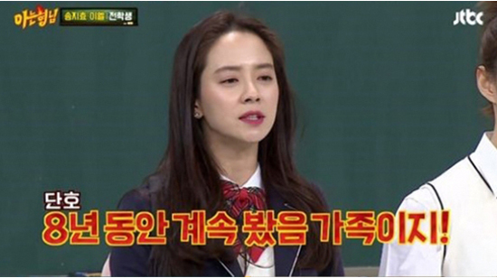 실시간 검색어에 '송지효'가 등장해 네티즌들의 관심이 쏟아지고 있는 가운데 김종국과 열애설이 재조며 되고 있다.그동안 송지효는 김종국과 수차례 열애설이 나돌았으나 모두 부인했다.최근 방송된 JTBC 예능프로그램 '아는 형님'에서는 송지효는 이엘과 함께 출연했다.이날 강호동은 “지효 말투에 종국이 말투도 보인다”며 송지효에게 김종국과의 열애설에 대해 물었다. 이에 송지효는 “8년을 매주 보는데 어떻게 안 닮을 수 있냐”고 쿨하게 답했다.송지효는 이어 "8년 동안 매주 월, 화에 봤으니 가족이다. 8년 동안 사랑으로 진전되지 않았으면 아닌거다"라며 "김종국과 엮지 마라"고 선을 그었다.송지효는 또 지난해 3월 18일 방송된 SBS '미운우리새끼'(이하 미우새)에 스페셜 MC로 출연해 엄마들 사랑을 독차지했다.특히 최근 열애설 주인공인 김종국의 어머니는 남다른 눈빛으로 송지효를 바라봤다.김종국 어머니는 "예전에 봤다. 외국 나갈 때도 한번 인사를 해서 안다"고 밝혔고, 송지효는 "'런닝맨' 행사 때문에 해외를 갔는데 어머님이랑 같이 갔다. 우연치않게 비행기에서 죽다 살았다"고 회상했다.이후 송지효는 김종국과 열애설에 대해 "오빠랑 너무 친하다 보니 그런 기사가 나고 나서 웃으면서 얘기했다"고 말했다.이어 송지효는 "지효씨가 우리 종국이가 맘에 안 드나보다. 8년이나 같이 방송을 했는데도 스캔들만 나다 뿐이지 그게 없다"는 김종국 어머니의 말에 "그런 건 아니고 일을 할 때 감정이 섞이면 안 되니까. 아무래도 몸 쓰고 싸우다 보니까.."라며 곤란해했다한편 송지효는 1981년생으로 올해 나이 서른 아홉살이며 1976년생으로 올해 마흔 네살인 김종국과 다섯살 차이다.