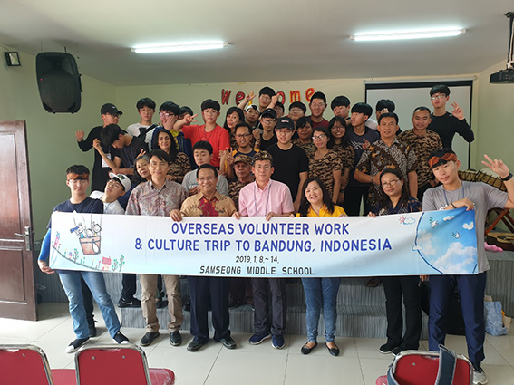 의성군 단북면 삼성중학교(교장 권용모)는 지난 8일 부터 14일 까지 5박 7일간 인도네시아 자카르타와 반둥으로 해외봉사활동 및 문화체험학습을 다녀왔다. ‘사랑과 희생 & 섬김과 나눔의 실천 여행!’이라는 주제로 진행된 이번 봉사활동 및 문화체험학습은 2~3학년 학생 22명, 인솔교사 3명이 함께 다녀왔으며, 전체 프로그램이 학교발전기금으로 진행되어 모든 학생들이 자비 부담 없이 다녀왔다.인도네시아 자카르타와 반둥 현지에 도착한 삼성중학교 학생들과 교사들은 다음과 같은 일정으로 봉사활동과 문화 체험을 실시했다. 첫째날인 9일은 파타힐라 광장, 도자기 박물관, 와양 박물관, 역사(바타비아) 박물관을 견학하여 인도네시아의 지난날들을 살펴 보았다. 이어 10일과 12일은 Anugra 초등학교와 Macedonia 초등학교를 각각 방문하여 난타 공연, K-Pop, 인도네시아 국가 합창, 인도네시아 CCM을 합창하였다. 또한 풍선 아트, 실 팔찌 끼워 주기, 폴라로이드 사진 찍기 활동과 단체 사진 촬영 등을 통해 섬기고 나누며 현지 학생들과 함께 소통하는 시간을 가졌다. Anugra 초등학교와 Macedonia 초등학교 방문을 마친 후에는 인도네시아 전통 민속공연인 앙쿨릉 공연을 관람했다. 11일은 ‘땅꾸반쁘라후’ 화산 투어를 통해 유황 온천에 발을 담그는 체험을 하였고, 1월 12일에는 루왁 커피 농장을 방문해 사향 고양이를 보고 루왁 커피를 생산하는 과정을 살펴보는 등 마지막 날인 13일은 ‘따만사파리’를 방문해 다양한 동물들을 가까이에서 관찰하는 체험을 했다.정구영 삼성중학교 교감은 “우리 학생들이 인도네시아 해외봉사활동 및 문화체험학습을 통해 사랑의 마음으로 희생하고 섬기며 나누는 삶의 가치를 배우고 이를 실천할 수 있는 시발점 역할을 한 것 같아 매우 가치 있는 활동이었으며, 앞으로도 이러한 활동이 지속될 수 있도록 노력하겠다.”고 밝혔다.