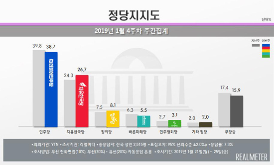리얼미터 2019년 1월 4주차 주간집계(무선 80 : 유선 20, 총 2,515명 조사)에서, 자유한국당이 1주일 전 1월 3주차 주간집계 대비 2.4%p 오른 26.7%로 2주 연속 상승, 국정농단 사태가 본격화한 2016년 10월 3주차(29.6%) 이후 2년 3개월 기간에 가장 높은 지지율을 기록한 것으로 조사됐다.한국당은 작년 9월 평양 남북정상회담 직후인 9월 4주차(17.0%) 이후 현재까지 4개월이 경과하는 동안에 9.7%p가 상승하며 오름세를 나타냈고, 단기적으로는 1주일 전 금요일(18일, 23.6%) 이후 한 주 동안 전반적인 상승세를 이어가며 지난주 금요일(25일)에는 27.7%까지 올랐다.이와 같은 상승세는 경제상황에 대한 부정적 인식이 장기간 이어지며 정부·여당의 약세가 지속된 데 따른 반사이익과 최근에는 2·27 전당대회를 앞두고 황교안 전 총리, 오세훈 전 시장, 홍준표 전 대표 등 주요 당권주자들의 지역행보가 잇따르며 언론보도가 증가하는 등 이른바 ‘컨벤션 효과’가 나타나고 있기 때문인 것으로 풀이된다.세부적으로는 경기·인천, 30대와 40대를 제외하고, 대구·경북(TK)과 충청권, 부산·울산·경남(PK), 서울, 50대와 60대 이상, 20대, 보수층과 중도층 등 대부분의 지역과 계층에서 올랐다.이 결과 TK(한 45.0%, 민 26.6%)와 PK(한 36.8%, 민 32.6%) 등 영남권, 50대(한 34.1%, 민 32.8%)와 60대 이상(한 41.3%, 민 26.2%), 보수층(한 61.5%, 민 12.8%), 자영업(한 34.2%, 민 31.4%)과 농림축어업(한 33.2%, 민 32.7%), 주부(한 36.0%, 민 34.7%)에서 민주당에 앞섰고, 충청권(민 32.4%, 한 31.3%)에서는 민주당에 박빙의 격차로 따라붙은 것으로 나타났다. 서울과 경기·인천, 수도권 역시 9월 평양 남북정상회담 직후 9월 4주차(16.5%) 이후 조금씩 상승하며 작년 11월 3주차(20.6%)부터 지난주(22.0%)까지 10주 연속 20%대 초반을 유지했다.반면 더불어민주당은 38.7%(▼1.1%p)로 2주 연속 하락하며 30%대 후반에 머물렀고, 정의당은 8.1%(▲0.6%p)로 한 주 만에 8%대를 회복한 것으로 조사됐다.20대와 학생에서 상당 폭 이탈한 바른미래당은 5.5%(▼0.8%p)로 작년 12월 1주차(5.9%) 이후 약 두 달 만에 다시 5%대로 하락했고, 민주평화당은 호남에서 이탈했으나 경기·인천과 충청권에서 소폭 결집하며 3.1%(▲0.4%p)로 상승한 것으로 나타났다.문재인 대통령의 취임 90주차 국정수행 지지율(긍정평가)은 1.4%p 내린 47.7%(부정평가 45.7%)로 2주 연속 소폭 하락하며 약보합세가 이어졌다. 다만 여전히 긍정평가가 부정평가를 오차범위 내에서 앞선 것으로 나타났다.이와 같은 내림세에는 ‘손혜원 의원 논란’과 더불어 지난주 후반의 조해주 중앙선거관리위원회 위원 임명, 지방 SOC 사업에 대한 예비타당성 조사 면제를 둘러싼 논란이 일부 영향을 미친 것으로 보인다.문 대통령의 지지율은 1주일 전 금요일(18일) 일간집계에서 48.8%(부정평가 45.5%)를 기록한 후, 제2차 북미정상회담 개최합의와 손혜원 의원의 민주당 탈당 소식이 전해졌던 주말을 경과하며, 문 대통령의 ‘평화를 경제기회로’2차 북미정상회담 관련 발언 보도가 있었던 21일(월)에는 ‘손혜원 논란’을 둘러싼 야당의 공세와 보도가 확대되며 47.0%(부정평가 46.8%)로 내렸다가, 문 대통령의 ‘재난에 준한 미세먼지 대처’ 국무회의 발언 보도가 있었던 22일(화)에는 47.4%(부정평가 45.3%)로 오른 데 이어, 손혜원 의원의 목포 기자간담회가 여론의 관심을 모았던 23일(수)에도 47.9%(부정평가 44.5%)로 완만하게 상승했다.하지만 주 후반 양승태 전 대법원장 구속, 국민연금 ‘스튜어드쉽 코드(주주권 행사)’ 논란, 조해주 중앙선관위원 임명과 한국당의 국회일정 전면 거부 선언이 있었던 24일(목)에는 47.6%(부정평가 45.9%)로 다시 소폭 하락했고, 지방 SOC 사업 예비타당성 조사 면제와 한국당의 ‘5시간 30분 단식’을 둘러싼 논란이 있었던 25일(금)에도 47.5%(부정평가 46.8%)를 기록하며 약보합세가 이어졌다.세부 계층별로는 PK와 경기·인천, 30대와 40대, 무직, 진보층에서 상승한 반면, 충청권과 TK, 호남, 서울, 20대와 50대, 60대 이상, 사무직과 노동직, 보수층에서는 하락한 것으로 조사됐다.[정당 지지율] 민주당 38.7%, 자유한국당-26.7%, 정의당-8.1%, 바른미래당-5.5%, 민주평화당-3.1%, 무당층-15.9%-민주당, 2주 연속 하락하며 30%대 후반에 머물러. 충청·TK, 60대이상·50대·20대, 노동직·무직·주부·자영업, 보수층 이탈, 반면 호남·서울, 30대·40대, 학생은 결집-한국당, TK·PK·충청, 50대이상·20대, 보수층 등 대부분의 지역·계층 결집하며 2주 연속 상승, 국정농단 사태 본격화 이후 2년3개월 만에 최고치. 작년 9월 평양남북정상회담 직후 9월4주차 이후 4개월 동안 9.7%p 상승하며 오름세. 단기적으로 18일(금) 이후 한 주 동안 전반적 상승세 유지하며 25일(금) 일간집계 27.7%까지 올라. ▲경제상황에 대한 부정적 인식 장기화와 정부·여당의 약세에 따른 반사이익, ▲황교안·오세훈·홍준표 당권주자 지역행보, 언론보도 증가에 의한 ‘컨벤션 효과’ 영향. TK·PK, 50대·60대이상, 보수층, 자영업·농림축어업·주부에서 민주당 앞섰고, 충청에서는 박빙의 격차로 따라붙어. 수도권 역시 10주 연속 20%대 초반 유지-정의당, 소폭 상승하며 한 주 만에 8%대 회복-바른미래당, 20대·학생 상당폭 이탈하며 두 달 