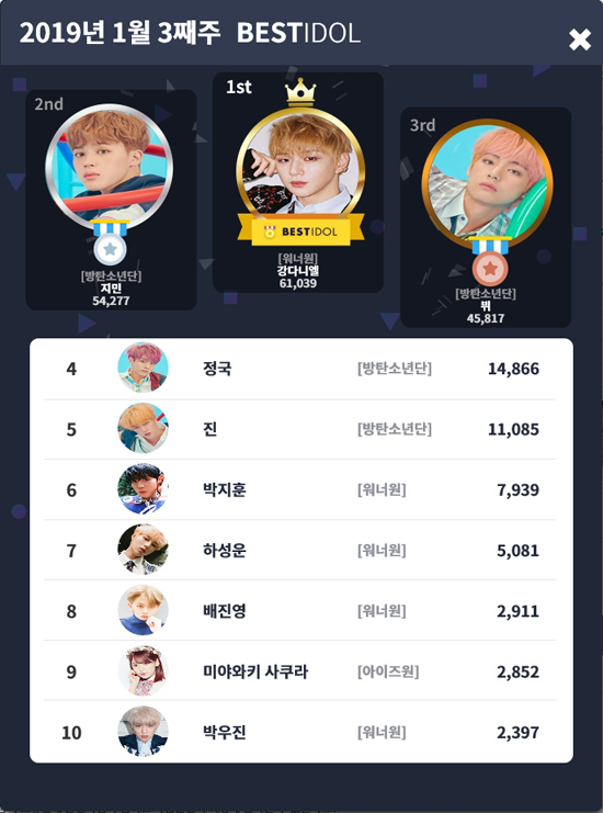 강다니엘이 1월 3주 차 베스트아이돌로 선정되며 49주 연속이라는 최장 기록을 세우고 있다. 1월 4주차 투표에서 강다니엘이 베스트아이돌로 선정되면 50주 연속이라는 엄청난 기록을 갖게 된다. 이번 주, 50주 연속 1위를 지키면서 강다니엘 신드롬을 보여 줄 수 있을지 귀추가 주목된다. 2018년 2월 2주 차부터 이어진 그의 1위 행진은 곧 1년 연속이라는 기록도 앞두고 있다. 1월 3주 차 투표 열기는 여느 때보다 뜨거웠고 베스트아이돌 오픈 이래 최대 동시 접속 인원이라고 밝힌 바 있다. 49주간 한 번도 놓치지 않은 1위를 지키려는 강다니엘과 그 자리를 노리는 지민, 뷔의 순위 다툼이 너무나 뜨거웠고, 순위 다툼 또한 손에 땀을 쥐게 했다. 한주간 각각의 랭킹 자리를 놓고 뺏고 뺏기고를 반복하며 정신없는 등락을 보였으나, 결국 1월 2주 차 랭킹과 단 한 명도 빠지고 더해지지 않은 체 같은 순위를 유지하며 투표를 마감하게 되었다. 여자 아이돌 차트는 지난주와 마찬가지로 아이즈원 에서 모두 차지했다. 아이즈원 멤버들의 랭킹 점유율은 점점 높아지고 있으며, 매주 멤버들의 전체 랭킹 순위가 조금씩 올라가고 있어 앞으로의 귀추가 주목된다. 미야와키사쿠라(아이즈원)는 기세를 몰아 14주 연속 1위를 차지했으며 2위는 전주 대비 4계단 오른 조유리, 3위는 3계단 오른 장원영, 4위는 안유진, 김채원 두 명이 공동으로 안착했다. 베스트아이돌 영광의 TOP10에는 1위 강다니엘(워너원), 2위 지민(방탄소년단), 3위 뷔(방탄소년단), 4위 정국(방탄소년단), 5위 진(방탄소년단), 6위 박지훈(워너원), 7위 하성운(워너원, 핫샷), 8위 배진영(워너원), 9위 미야와키사쿠라(아이즈원) 이며, 영광의 TOP10 마지막은 박우진(워너원)이 장식하며 마감되었다. 그룹 순위로는 방탄소년단이 9주 연속 흔들림 없이 1위를 지키면서 그 기세는 날로 강해지고 있다. 2위는 워너원이 바짝 쫓고 있으며, 3위 아이즈원, 4위 뉴이스트, 5위는 EXO가 차지했다. 한편 베스트 아이돌은 매주 투표를 통해 최고의 아이돌을 뽑으며 사용자들이 실시간으로 투표 내역을 확인할 수 있는 투명한 시스템이 특징이다.