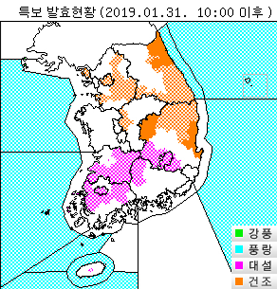 목요일인 1월 31일 오전 10시 30분 현재, 전국이 흐리고 충청남부와 부산과 대구 등 남부지방에는 눈 또는 비가 내리는 곳이 있다. 특히, 전라도와 경상내륙에는 대설주의보가 발효된 가운데 1~5cm 가량의 눈이 쌓여 있으니, 교통안전에 각별히 유의해야 한다.* 주요지점 적설 현황(31일 06시 현재, 단위: cm)[목측] 전주 0.3[CCTV] 임실 5.0 장수 5.0 무주 4.0 진안 3.0 영광 1.5 금산 1.0 고창 0.5 정읍 0.5[레이저] 주천(진안) 4.1 서하(함양) 3.8 완주 2.7 줄포(부안) 1.5 김제 0.6 곡성 0.5이 눈은 제주도남쪽해상을 지나는 기압골에서 남풍이 유입되고, 북서쪽에서는 북서풍이 유입되면서 온도차에 의한 불안정이 강해져 전라도와 경상도를 중심으로 많은 눈이 내리고 있다.앞으로 전라도지역은 오늘 15시까지, 경상도는 18시까지 이어지겠고, 강원영동은 아침(09시 이후)에 눈이 시작되어 밤(24시)까지 이어지면서 다소 많은 눈이 내려 쌓이는 곳이 있겠으니, 비닐하우스 등 시설물 관리에 유의해야 한다. 또한, 내린 눈이 쌓이거나 얼면서 도로가 미끄러운 곳이 많겠고, 특히 남부지방에는 출근 시간대에 다소 강한 강도의 눈이 내리는 곳도 있겠으니, 보행자 안전 및 교통안전에 각별히 유의해야 한다. 오늘과 내일 미세먼지 농도는 대기 확산이 원활해 전국 대부분 지역에서'보통'이나 '좋음' 수준을 보일 것으로 예상된다.-지역별 상세날씨*경기31일 경기도는 중국 북부지방에서 남하하는 고기압의 영향으로 대체로 흐리겠다.기상청에 따르면 이날 아침 최저기온은 -7~-2도, 낮 최고기온은 -1~9도다.시·군별 예상 기온은 수원 -2~0도, 파주 -8~1도, 이천 -3~2도, 평택 -3~0도, 광명 -3~0도 등이다.경기 서해 앞바다의 물결은 0.5m로 일겠다. 미세먼지 농도는 '보통'으로 예보됐다.*인천31일 인천 지역은 제주도 남쪽해상을 지나는 기압골의 영향을 받아 흐리겠다.수도권기상청 인천기상대에 따르면 이날 아침 최저기온은 부평구·강화군·계양구·서구 -5도, 미추홀구·남동구·동구·연수구·옹진군·중구 -4도를 기록하겠다.낮 최고기온은 계양구·동구·연수구·서구 1도, 부평구·미추홀구·남동구·강화군 0도, 중구 -1도, 옹진군 -2도로 예상됐다.바다의 물결은 0.5~2.0m로 높게 일겠다. 미세먼지 농도는 보통 수준을 보이겠다. *부산 경남31일 부산·경남은 제주도 남쪽해상을 지나는 기압골의 영향을 받다가 차차 벗어나, 중국 북부지방에서 남하하는 고기압의 영향을 받겠다. 흐리고 이른 새벽에 경남북서내륙부터 눈이 시작돼 부산과 경상남도 전지역으로 비 또는 눈이 내리다가, 경남서부지역은 오후에, 그 밖의 경남지역과 부산과 늦은 오후에 그치겠다.부산지방기상청에 따르면 이날 아침 최저기온은 부산 4도, 창원 2도, 진주 2도, 거창 0도, 통영 3도로 전날보다 높겠다.낮 최고기온은 부산 5도, 창원 3도, 진주 4도, 거창 2도, 통영 4도로 전날보다 낮아지겠다.미세먼지 농도는 부산과 경남 모두 ‘보통’ 수준으로 예보됐다.바다의 물결은 남해동부 앞바다에서 0.5~1.5m로, 먼바다에서 1.5~2.5m로 일겠다.*대전 충남 대전·충남지역은 새벽부터 오전 사이에 눈발이 날리다 저녁부터 맑아지겠다.대전지방기상청에 따르면 아침 최저기온은 계룡·청양 영하 4도, 공주·천안·아산·당진 영하 3도, 논산·금산·예산·서산·홍성 영하 2도, 대전·부여·태안·보령·서천 영하 1도로 전날과 비슷하거나 0~5도 낮겠다.낮 최고기온은 부여·서천 2도, 대전·공주·논산·계룡·보령 1도, 금산·아산·예산·청양·서산·태안·당진·홍성 0도, 천안 영하 1도로 전날과 비슷하거나 0~8도 낮겠다.미세먼지 농도는 보통 수준을 보이겠다.*충북 세종31일 충북·세종 지역은 흐리고 산발적으로 눈이 내리겠다. 예상 적설량은 1㎝내외다.아침 최저기온은 제천 영하 4도, 세종·괴산·진천·충주·음성·보은 영하 3도, 증평·단양·옥천 영하 2도, 청주·영동 영하 1도 등 영하 4도에서 영하 1도 사이에 머물겠다.낮 최고기온은 세종·청주·증평·괴산·진천·충주·음성·제천·보은·옥천·영동 1도, 단양 2도 등 1도에서 2도 분포를 보이겠다.미세먼지 농도는 보통으로 예상된다.*대구 경북31일 대구와 경북지역은 오후까지 비나 눈이 내릴 것으로 예상된다.대구기상지청에 따르면 제주도 남쪽 해상을 지나는 기압골의 영향에서 차차 벗어난 후 중국 북부지방에서 남하하는 고기압의 영향을 받아 오후까지 비나 눈이 내리겠으며, 동해안은 밤늦게 눈이 그치겠다.적설량은 대구와 경북 남부, 동해안, 울릉도, 독도 3~8㎝(5~10㎜), 북부 내륙은 1~5㎝로 전망된다.아침 최저기온은 김천 영하3도, 안동 영하1도, 대구 1도, 포항·울진 2도 등 영하4도~2도, 낮 최고기온은 울진 5도, 포항 4도, 대구·안동 2도, 김천 1도 등 1~5도로 전날보다 8~10도 가량 낮겠다.미세먼지는 '보통' 수준을 보이겠지만 오전에는 농도가 다소 높을 것으로 예상된다.*광주 전남31일 광주와 전남은 비나 눈이 내리고 낮기온은 1도 안팎에 머물겠다.광주지방기상청에 따르면 이날 광주·전남은 오후까지 제주도 남쪽해상을 지나는 기압골의 영향으로 비나 눈이 오겠다.전날부터 31일 오후까지 예상 강수량은 남해안 5~20㎜, 그밖의 지역 5~10㎜고, 예상 적설량은 동