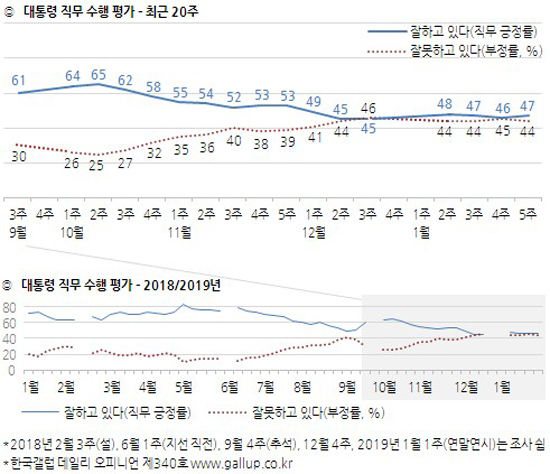 한국갤럽이 2019년 1월 다섯째 주(29~31일) 전국 성인 1,004명에게 문재인 대통령이 대통령으로서의 직무를 잘 수행하고 있다고 보는지 잘못 수행하고 있다고 보는지 물은 결과, 47%가 긍정 평가했고 44%는 부정 평가했으며 8%는 의견을 유보했다(어느 쪽도 아님 4%, 모름/응답거절 4%).대통령 직무 긍정률은 지난주 대비 1%포인트 상승, 부정률은 1%포인트 하락했다. 양자 격차는 3%포인트로, 사실상 긍·부정률이 비슷한 상태가 두 달 가까이 지속되고 있다. 연령별 긍/부정률은 20대 53%/32%, 30대 59%/37%, 40대 56%/35%, 50대 40%/51%, 60대+ 32%/60%다. 지지정당별로 보면 더불어민주당 지지층의 79%, 정의당 지지층의 60%는 대통령 직무 수행에 대해 긍정적으로 평가했지만, 자유한국당 지지층은 90%가 부정적이며 지지정당이 없는 무당(無黨)층에서도 부정적 견해가 더 많았다(긍정 32%, 부정 54%).대통령 직무 수행 긍정 평가자에게 그 이유를 물은 결과(468명, 자유응답) '북한과의 관계 개선'(21%), '최선을 다함/열심히 한다'(11%), '외교 잘함'(9%), '소통 잘함/국민 공감 노력', '서민 위한 노력/복지 확대'(이상 7%), '대북/안보 정책'(5%), '전 정권보다 낫다', '전반적으로 잘한다'(이상 3%), '일자리 창출/비정규직 정규직화', '경제 정책', '개혁/적폐 청산/개혁 의지', '부동산 정책'(이상 2%) 순으로 나타났다. 직무 수행 부정 평가자는 부정 평가 이유로(444명, 자유응답) '경제/민생 문제 해결 부족'(41%), '대북 관계/친북 성향'(12%), '독단적/일방적/편파적', '최저임금 인상', '일자리 문제/고용 부족'(이상 5%), '북핵/안보', '인사(人事) 문제', '서민 어려움/복지 부족', '전반적으로 부족하다', '부동산 정책', '신뢰할 수 없음/비호감'(이상 2%) 등을 지적했다.