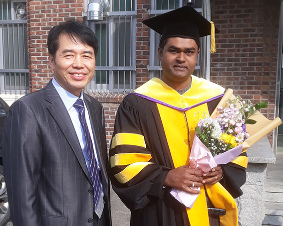 경북대 박사 졸업생이 학위과정 기간에 제1저자로 SCI급 논문 17편을 발표해 눈길을 끈다. 주인공은 지난 22일 경북대 학위수여식에서 박사학위를 받은 비스와나쓰 바드라(37)씨.바드라 씨는 박사 학위과정 동안 제1저자로 쓴 논문 17편을 포함, 총 27편의 논문을 SCI급 학술지에 발표했다. 제1저자로 쓴 논문이 게재된 학술지는 '어플라이트 카탈리시스 B: 환경(Applied Catalysis B: Environmental)', '저널 오브 카탈리시스(J. Catalysis)' 및 '머티리얼즈 투데이(Materials Today)' 등 대부분 상위 10% 저널이다.바드라 씨가 쓴 논문은 수처리 및 연료유의 정제에 관한 연구 결과다.다공성이 우수한 물질을 합성, 화학적으로 가공해 물과 연료유에 존재하는 유기오염물질의 제거를 위한 흡착 혹은 산화 반응 성능을 크게 개선했다는 것이 주요 내용이다. 방글라데시 출신인 바드라 씨는 방글라데시 최고 명문인 다카대에서 학사학위를, 일본 큐수대에서 유기화학 관련 연구로 석사학위를 취득했다. 석사학위 취득 후 다 년간 회사원 생활을 하다가 청정화학 관련 체계적 연구를 위해 2015년 3월에 경북대 화학과 박사과정에 입학했다. 박사과정 기간 동안에 우수한 연구 성과로 BK21플러스사업단 우수논문상을 수상하기도 했다. 바드라 씨는 경북대에서 1년간 박사후 과정을 밟으며, 연구에 매진할 계획이다. 지도교수인 정성화 교수(경북대 화학과)는 "바드라 씨가 제1저자로 쓴 17편의 논문의 총 IF는 126로, 논문 당 IF가 7.4에 달해 양적인 업적뿐만 아니라 논문의 질도 매우 우수한 것으로 나타났다"며 "바드라 씨의 연구결과는 우수한 흡착제 및 촉매 반응 공정 개발 방향을 제시해 향후 깨끗한 환경을 만들기 위한 유해 유기물질 제거 기술 개발에 기여할 것으로 기대된다"고 밝혔다.