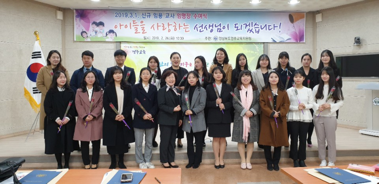 경주교육지원청(교육장 권혜경)은 26일 교육지원청 3층 대회의실에서 다음달 1일자 신규 임용 교사 25명과 해당 학교 교감, 교육지원청 직원 등 약 50여명이 참석한 가운데 “신규 임용 교사 임명장 수여식”을 개최했다.