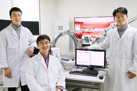 DGIST 연구팀이 복잡한 혈관 내에서 원하는 방향으로 조향(操向)과 이동이 가능해 만성완전폐쇄병변(CTO) 만성완전폐쇄병변(CTO)과 같은 심혈관 질환이 발생한 부위까지 정확하게 도달할 수 있는 마이크로로봇 개발에 성공했다. 이번 연구를 통해 심혈관 질환 시술 시간을 단축시키고 성공률을 높일 것으로 기대된다.DGIST는 로봇공학전공 최홍수 교수팀이 한양대 이병주 교수팀, 스위스취리히연방공대(ETH) 브래들리 넬슨(Bradley J. Nelson) 교수팀과의 공동연구를 통해 심근경색 가운데 만성완전폐쇄병변의 치료 성공률을 향상시킬 수 있는 '가이드와이어 부착형 마이크로로봇'을 개발했다고 27일 밝혔다.지금까지 막힌 혈관을 뚫어주는 관상동맥 중재술 관상동맥 중재술에 사용되던 가이드와이어는 시술자가 수동으로 방향과 위치를 제어하기 때문에 시술의 성공률과 속도는 시술자의 숙련도에 의존해왔다. 시술자가 복잡한 혈관이나 분지관(分枝管)에서 끝단이 구부러진 가이드와이어를 수동으로 방향을 잡아 밀어주다보니 정확한 방향과 위치 제어가 어렵다는 점이 한계로 지적돼왔다.최 교수팀은 이러한 한계를 극복하기 위해 유연하면서도 생체에 적합한 폴리머와 외부 자기장으로 방향과 위치를 제어할 수 있는 네오디듐 자석을 이용해 지름 500마이크로미터(㎛, 100만 분의 1m), 길이 4밀리미터(mm) 크기의 원통형의 마이크로로봇을 만들어 가이드와이어 끝부분에 부착했다. 외부 자기장 시스템으로 마이크로로봇을 제어해 원하는 방향으로 가이드와이어 조종이 가능하고, 마스터-슬레이브 시스템(Master-Slave System)을 통해 직선운동이 가능한 가이드와이어 부착형 소프트 마이크로로봇으로 개발했다.연구팀은 마이크로로봇의 비선형적으로 변형되는 유연한 움직임을 구현하기 위해 마이크로로봇의 움직임을 수학적으로 계산해 예측하고 그 결과를 제어하는 피드포워드(Feedforward) 방식으로 복잡한 혈관을 통과하는 실험에 성공했다. 또한, 심장의 관상동맥을 모사한 3차원 혈관 모형에서 원하는 부위에 도달하는 실험도 성공했으며 세포 생존 실험을 통한 마이크로로봇의 생체적합성도 확인했다.연구팀이 개발한 가이드와이어 부착형 마이크로로봇은 자기장에 의한 정밀한 제어와 마스터-슬레이브 시스템을 통한 직선운동이 가능해 복잡한 혈관 속 원하는 부위에 빠르게 도달할 수 있어 기존의 관상동맥 중재술의 한계를 극복하고 시술의 성공률과 효율을 높일 수 있을 것으로 기대된다. 또한, 기존 방법에 비해 신속하게 질병 부위에 도달할 수 있어 환자와 시술자의 엑스레이에 의한 방사선 피폭량을 줄이고, 환자의 혈관 손상도 줄일 수 있다.DGIST 로봇공학전공 최홍수 교수는 "가이드와이어 부착형 마이크로로봇을 이용하면 시술자의 경험에 의존하던 기존 방법과 비교해 질병의 원인인 부분을 정확하고 빠르게 찾아 안정적으로 시술할 수 있어 심장 질환 시술 시간을 단축시키고 성공률을 높일 수 있다"며 "앞으로 연구팀은 관련 기업과 후속 연구를 진행해 실제 의료 현장에서 활용할 수 있는 제품 개발에 노력하겠다"고 말했다.한편 이번 연구는 로봇연구 분야 최고 국제학술지 '소프트 로보틱스(Soft Robotics)' 13일자 표지논문으로 게재됐으며, 산업통상자원부와 과학기술정보통신부의 지원으로 수행됐다.