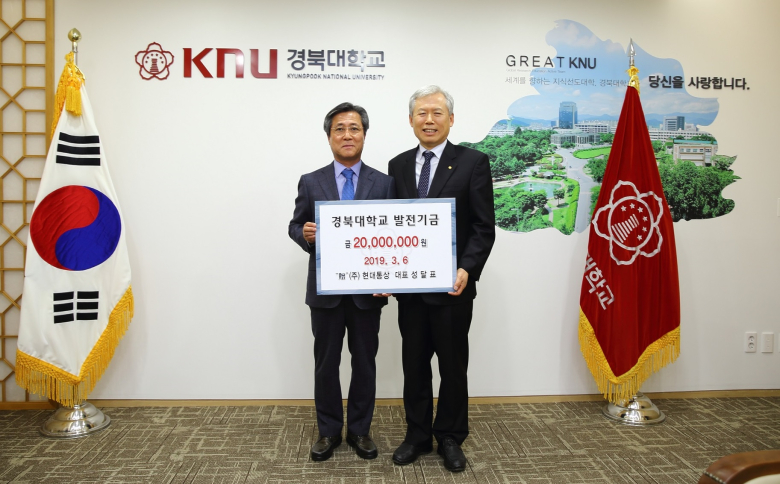 성달표 ㈜현대통상 회장(경북대 총동창회 부회장)은 지난 6일 김상동 경북대 총장을 만나 인재 육성과 도서관 발전을 위해 써달라며 발전기금 2천만원을 전달했다. 성 회장은 경북대 글로벌플라자 건립 발전기금, 경북대 경영대학원 발전기금, 경북대 경상대학 학생 3명에게 특지장학금을 전달한 바 있다. 2005년에는 경북대 제5회 경영자상을 수상하기도 했다. 매년 인재육성 장학금, 불우이웃돕기성금, 체육진흥기금을 후원하는 등 노블리스 오블리제의 정신을 몸소 실천해오고 있다.전달된 발전기금은 ‘도서관기금’으로 적립되어 현재 리모델링이 완료된 도서관의 장서 및 시설 확충 등을 위해 사용될 예정이다. 한편 경북대 도서관은 최근 45억원을 투입해 열람관인 신관 1층과 자료관인 구관 1층을 하나의 공간으로 통합, ICT 기반의 학습 및 연구 공간은 물론 북갤러리, 카페, 세미나·전시 공간을 갖춘 복합문화공간으로 새단장했다.