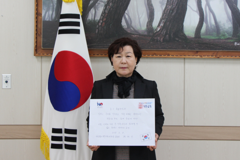 제100주년 3.1절 기념식 및 만세재현 시민 대행진에 참석해 만세운동을 재현하는 등 애국심과 자긍심을 드높인 권혜경 교육장은 이번에도 독립선언서 19항 “일본이 우리를 억누르고 민족 차별의 불평등과 거짓으로 꾸민 통계 숫자에 따라 서로 이해가 다른 두 민족 사이에 화해할 수 없는 원한이 생겨나고 있다.”를 필사하고 다음 주자로 김정남 용황유치원장, 이형석 모아초등학교장, 강성호 안강중학교장을 지목했다.