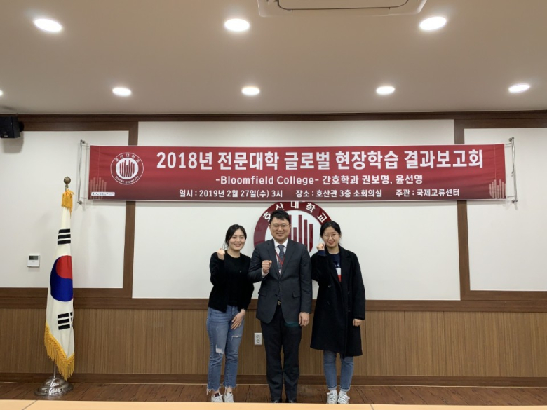 호산대학교는 최근 대학 본부 소회의실에서 ‘전문대학 글로벌 현장학습’ 결과 보고회를 가졌다. 호산대 국제교류센터 주관으로 개최된 이 날 보고회에서는 2018학년도에 미국 뉴저지 주 블룸필드대학교에 파견된 간호학과 3학년 권보명, 윤선영 학생의 현장 실습 경험 발표를 중심으로 진행됐다. 이들 학생들은 블룸필드대학교에서 어학연수와 전공 관련 병원 현장학습과 현장학습 세미나 등 총 16주간의 교육을 받고 귀국했다. 김재현 부총장은 이 날 보고회에서 “오늘 발표된 내용을 참고해서 2019학년도 정부지원사업 신청시에는 좀더 알찬 프로그램을 만들어서 학생들이 전공과 관련하여 해외 현장학습 경험을 더 많이 할 수 있도록 지원을 아끼지 않겠다”고 말했다. 호산대는 교육부와 한국전문대학교육협의회가 주관하는 ‘2018년도 전문대학 글로벌 현장학습 지원사업’에 4년 연속 선정됨으로써 학생들의 글로벌 역량 향상에 큰 도움이 됐다. ‘글로벌 현장학습 지원사업’은 전문대학 학생들에게 다양한 해외 현장학습의 기회를 제공함으로써 글로벌 마인드와 전공 실무능력을 배양하여 학생들의 취업 역량을 키워주는 정부지원 프로그램을 말한다.