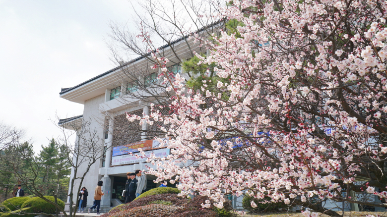 18일 오후 동국대학교 경주캠퍼스 교정에 긴 겨울을 지나 싱그러운 봄을 알리는 매화꽃이 화사하게 폈다.