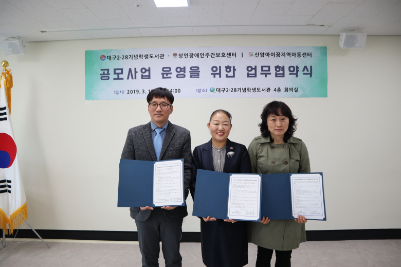 대구2.28기념학생도서관은 지난 18일 회의실에서 정보취약계층 독서문화프로그램 지원을 위해 신암아이꿈지역아동센터, 상인장애인주간보호센터와 업무협약을 체결했다. 이번 업무협약은 대구2.28기념학생도서관이 국립어린이청소년도서관 주관 '도서관 함께 책 읽기'(협력기관 신암아이꿈지역아동센터) 공모사업과 국립장애인도서관 주관 '공공도서관 장애인 독서문화프로그램'(협력기관 상인장애인주간보호센터) 공모사업에 선정됨에 따라 마련됐다.'도서관과 함께 책 읽기' 사업은 ▲사서와 함께하는 도서관 이용법, VR체험, 독서퀴즈 및 토론 ▲독서전문 강사가 진행하는 책 읽어주기 및 독서놀이 ▲연극인과 함께하는 책 연극 공연 ▲동화작가 초청 강연회 등을 진행한다.'공공도서관 장애인 독서문화프로그램 사업'은 ▲권정생 동화나라 및 생가 탐방 ▲다양한 동화작가의 동화책 읽고 융합놀이 활동 ▲대구2.28기념학생도서관 견학 등 총 12회의 프로그램으로 운영된다.노경자 관장은 "이번 협약을 통해 독서문화프로그램에 참여하는 모든 분들이 정서적으로 건강한 사회의 구성원으로 성장하는 계기가 되기를 바란다"고 말했다.