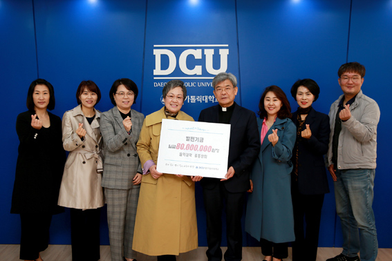 대구가톨릭대 음악대학 동창회는 21일 모교에 발전기금 8천만 원을 기부했다. 임신숙 음악대학 동창회장(대구가톨릭대 교수) 등 임원진은 이날 김정우 총장을 방문해 음악대학 장학기금으로 8천만 원을 전하고 환담했다. 음악대학 동창회는 20여 년 전부터 음악대학 발전기금, 글로벌 장학금, 오페라 공연기금 등을 꾸준히 기부하며 모교 발전을 위해 노력하고 있다.
