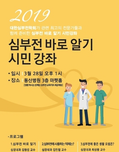 계명대 동산병원이 오는 28일 오후 1시 병원 3층 마펫홀에서 '심부전 바로 알기' 시민강좌를 연다. 심부전은 심장의 기능 저하로 신체에 혈액을 제대로 공급하지 못해 발생하는 질환이다. 심장내과 김형섭, 김인철, 최상웅 교수가 심부전의 원인 및 진단, 치료법 및 생활용법 등에 대한 상세한 정보를 제공한다. 이번 시민강좌는 대한심부전학회에서 주관하고 계명대학교 동산병원이 주최한다.