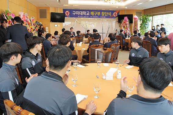 구미대학교(총장 정창주)가 국내 전문대학으로는 최초로 남자배구부를 창단했다. 대구경북권 대학의 배구부 창단으로도 처음이다. 구미대는 4일 경북 구미시 LG게스트하우스에서 창단식을 가졌다. 창단식에는 정창주 총장, 장세용 구미시장을 비롯 백승주 국회의원, 김태근 구미시의장과 시·도의회 의원, 대한배구협회 관계자, 관내 초·중·고 배구부 선수와 학부모 등 200여 명이 참석했다.이날 창단식에서는 경북체육회의 창단지원금과 대한체육협회의 지원용품을 비롯 구미시체육회, 구미시배구협회, 경북배구협회의 후원 전달식도 가졌다. 구미대 배구단은 국가대표출신 방지섭 씨(45)를 코치로 선임하고 3명의 스텝(트레이너, 팀 닥터, 전력분석관)과 고교 출신 선수 6명을 영입했다. 지난해 전국고교배구대회 우승팀인 경북 구미시 현일고 출신의 이신빈, 김현재 선수가 주축이다. 현재 대한배구협회(한국대학배구연맹)에 등록된 국내 대학 남자배구부는 13개 팀으로 구미대롤 포함하면 14개 대학이 된다.구미대 남자배구부 창단은 대구경북권 고교 배구 선수들의 역외유출을 방지하고 대학 진학의 길을 넓히는 계기가 될 것으로 기대를 모으고 있다. 지난해 말 대한배구협회 자료 기준으로 대구경북권 남자배구부 현황은 초등 6개 팀, 중등 4개 팀, 고교 3개 팀이었다. 3개 고교 팀에 등록된 선수는 33명이다. 구미대 배구부는 오는 4월19일 경산시에서 개최되는 경북도민체전을 시작으로 생활체육 전국 남녀배구대회(6월), 제100회 전국체전(10월)에 출전을 준비하고 있다. 또한 내년에는 우수한 고교 선수들을 적극 영입해 각종 전국대회에서 입상을 목표로 하고 있다. 장세용 구미시장은 “국내 대학 남자배구부 역사상 처음으로 전문대학에서 창단한다는 것은 매우 뜻깊은 일이며 경북과 구미시의 자랑이 될 것”이라며 “지역의 엘리트 스포츠와 생활체육 활성화에 큰 도움이 될 것으로 기대한다”고 말했다.정창주 총장은 “신생 배구부가 뿌리를 튼튼히 내리고 지속 성장할 수 있도록 경북도민과 구미시민을 비롯 배구협회 관계자들이 많은 응원과 관심을 가져 주길 부탁한다”며 “지역 체육의 저변 확대와 활성화를 위해 국내 뿐 아니라 몽골을 비롯 해외 친선교류전 등 활동 반경을 넓혀 갈 계획”이라고 밝혔다.