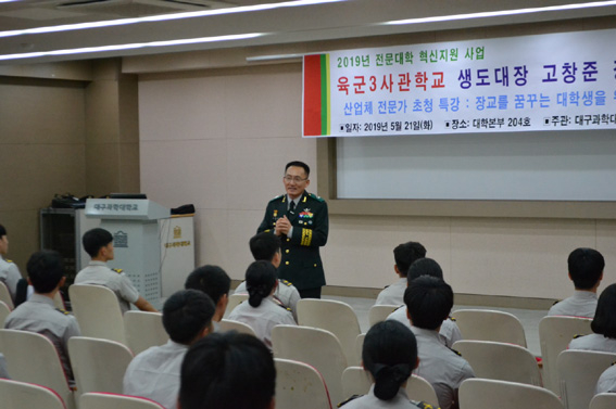 대구과학대 국방기술행정과는 지난 21일 대학본부 계단식 강의실서 학생 진로설계 및 역량강화를 위해 육군3사관학교 생도대장 고창준 장군 초청 특강을 실시했다고 밝혔다.