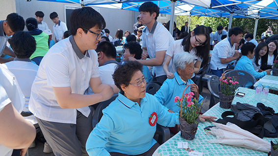 의성군 금성면 금성중·고등학교 전교생 67명은 지난 22일 금성면 탑리 2리 경로당 마당에서 탑리 2리 어르신들을 모시고 ‘치매 보듬마을 사회적 가족 만들기’ 봉사활동을 실시했다. 이번 봉사활동은 치매극복선도학교 사업의 일환으로 실시됐다.봉사활동은 사랑의 꽃바구니를 어르신들께 전해드리면서 공연은 시작됐으며 이어 금성 중고생들의 밴드 공연을 보며 어르신들이 좋아하는 노래도 같이 부르고 치매를 예방할 수 있는 다양한 게임을 함께 했다.또 어르신들과 학생들은 손에 손을 잡고 정답게 얘기를 나누고 서로 안마하면서 따뜻한 마음을 나눴다.봉사활동을 마치고 돌아서는 학생들의 발걸음을 보며 할머니 한 분은 마치 명절날 고향에 왔다가 상경하는 손자 손녀들을 보내는 심정으로 눈물을 글썽이는 모습을 보이며 학생들과 이별하는 아쉬운 마음을 드러내기도 했다.금성고 1학년 이상원군은 “저희들의 작은 사랑과 정성이 어르신들의 가슴에 오래 간직 돼 치매에 걸리지 않으시고 만수무강하시는데 조금이나마 보탬이 됐으면 좋겠다"며 "어르신들이 만면에 웃음을 띄고 즐거워하는 모습을 보니 너무 뿌듯하고 마치 백만금을 얻은 것 같다"고 말했다.