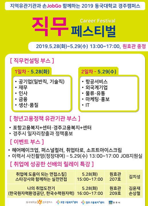 동국대학교 경주캠퍼스 대학일자리센터가 오는 28일부터 29일까지 이틀 동안 오후 1시부터 5시까지 교내 원효관 일원에서 ‘2019-1학기 직무 페스티벌(Career Festival·사진)’을 개최한다.