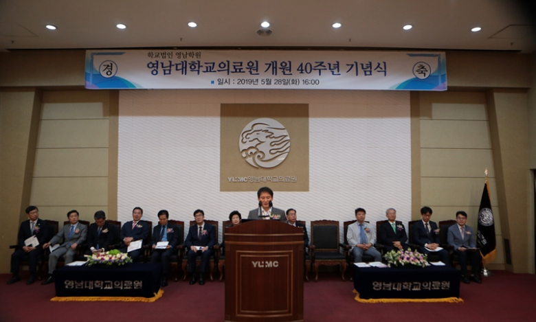 영남대의료원이 개원 40주년을 맞아 지난 28일 오후 본관 1층 이산대강당에서 기념식을 가졌다.이날 기념식에는 조재구 대구시 남구청장, 차순도 메디시티대구협의회 회장, 이성구 대구시의사회장, 장유석 경북도의사회장, 정태일 영남대 총동창회장, 한재숙 학교법인 영남학원 이사장, 서길수 영남대 총장, 박재훈 영남이공대 총장을 비롯해 전임 의료원장도 참석하여 함께 의료원 개원 40주년을 축하했다.이준 사무국장의 사회로 진행된 행사는 송시연 기획조정처장의 연혁 발표를 시작으로 귀빈들의 축하 인사말과 30년, 20년 그리고 10년 근속직원들에 대한 수상으로 이어졌다. 이후 병원의 발전에 기여한 공로를 인정받은 직원들과 타직원에게 귀감이 되어 온 직원들에게 모범상이 수여됐다.김태년 의료원장은 이날 기념사에서 영남대의료원이 걸어 온 40년을 되짚으며 '고객만족으로 신뢰 받는 영남 최고의 의료원'이라는 비전을 잊지 않고 이를 위해 노력해 온 교직원들의 노고를 치하했다. 한편 영남대의료원은 개원 40주년을 맞아 환우와 보호자를 위한 기념 음악회, 북 페스티벌(Book festival), 교직원 레포츠 경기, SNS 이벤트 등 다양한 행사를 진행하고 있다.