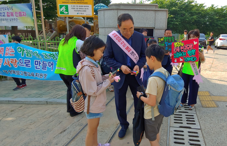 고령교육지원청(교육장 윤석찬)은 6월 4일 오전 8시부터 다산초등학교 앞에서 학교폭력 예방 캠페인을 실시하였다. 다산초등학교의 등굣길에서 실시한 이번 캠페인에서는 고령교육지원청 직원 10여명 및 다산초등학교의 전교직원, 학생 등이 참여하여 ‘학교폭력 없는 아름다운 고령! 우리의 관심과 사랑으로 만들어 갑시다!’라는 슬로건으로 학교 폭력이 없는 행복한 학교문화 조성을 위해 홍보 활동을 하였다. 학생들은 ‘상처주는 말 안하기’‘친구에게 관심 갖기’ 등 다양한 학교폭력예방 피켓을 들고 친구들과 공유하며 왕따없는 학교, 언어폭력이 없는 교실구현을 위한 다짐의 기회를 가질 수 있었다. 윤석찬교육장은 “학생들이 즐거운 마음으로 안심하고 학교를 다닐 수 있도록 선생님들과 학생들 모두 행복한 고령교육을 위해 꾸준히 노력해 달라”라고 참석자들에게 당부하였다.