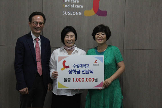 수성대 사회복지과 졸업생인 정금순(59·남천노인요양공동생활가정 원장)씨가 지난 7일 김선순 수성대 총장을 방문, 경제적으로 어려운 학생들을 위해 써달라며 장학금 100만원을 전달했다.
