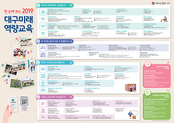 대구교육청이 11일 자체 제작한 '한눈에 보는 2019 대구미래역량교육'을 관내 교육기관 및 학교에 배포했다고 밝혔다.'한눈에 보는 2019 대구미래역량교육'은 대구미래역량교육의 4대 전략인 미래역량 교육, 다품교육, 학교 자율성, 따뜻한 교육공동체를 만들기 위해 추진되고 있는 모든 학교의 공통 정책을 실천과제별로 묶어 냈다.또 학교 급별, 대상 학생별 교육활동을 연계성 있게 단계형으로 나타냈으며, 정책 관련 용어 설명 자료를 교육청 홉페이지에 탑재해 QR코드로 링크함으로써 정책에 대한 이해를 돕는 자료로서의 활용성을 높였다.강은희 교육감은 "이번 자료는 유치원부터 고등학교까지의 학교 급별 교육활동과 학생 개인의 특성에 따른 교육 정책을 일목요연하게 볼 수 있도록 제작했다"며 "대구교육 전반의 교육활동에 대한 일관된 방향성을 알게 해 주고, 교육정책에 대한 학생‧학부모들의 궁금증을 해결하는 좋은 자료로 활용되기를 바란다"고 말했다.