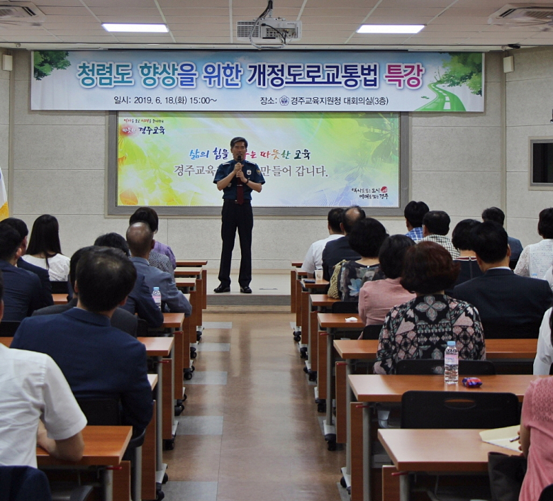경주교육지원청은 지난 18일 지원청 대회의실에서 각급 학교 행동강령책임관인 관내 교감(원감)과 행정실장 약 130여명을 대상으로 경주경찰서 이근우 서장의 강의로 ‘개정된 도로교통법 및 뺑소니사고 관련 홍보’를 실시했다.
