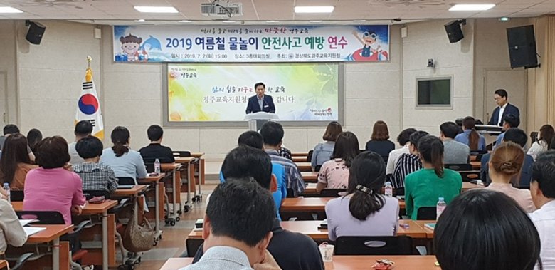 경주교육지원청 전태영 교육지원과장은 인사말을 통해 “학교현장에서는 무엇보다 물놀이 안전수칙에 대한 철저한 사전 교육이 중요하다”며 “학교 구성원들의 관심과 노력으로 학생들 모두가 안전한 여름을 보낼 수 있도록 힘껏 노력해 달라”고 당부했다.