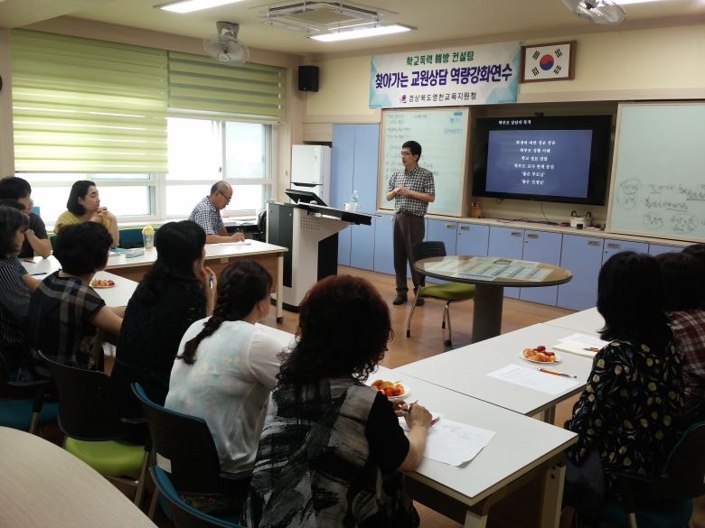 영천교육지원청 Wee센터는 지난 28일 영안중학교에서 “찾아가는 교원상담 역량강화 연수”를 실시했다. 영천Wee센터에서는 6월부터 12월까지 영천관내의 신청학교로 직접 찾아가 교원들을 대상으로 상담연수를 실시하고 있다. 연수내용은 학교의 요청에 따라 수퍼바이저를 초빙해 학교 사례중심의 질의응답 방식과 학생발달 수준에 대한 이해 및 상담의 기법에 대한 강의식 연수, 교사의 자기 회복과 성장을 통해 학교현장에서 교육활동에 전념할 수 있는 힐링 토크 콘서트 형식으로 실시하고 있다. 이번 연수는 대구대학교 심리학과 임영진 교수를 초빙해 학생들과의 의사소통 기술과 학급 내에서 어려움을 겪는 학생들에 대한 상담기법, 효과적인 학부모 상담 기법에 대한 내용으로 연수를 진행하여 교사들의 큰 호응을 얻었다.