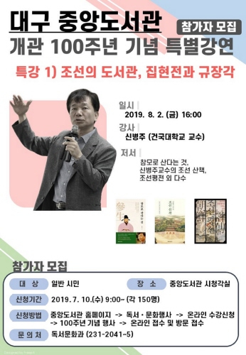 대구시립중앙도서관이 개관 100주년을 맞아 특별강연을 갖는다.중앙도서관은 내달 2일 오후 4시 신병주 건국대 교수의 특별강연으로 '조선의 도서관, 집현전과 규장각'이란 주제로 특별강연을 진행한다고 8일 밝혔다.이번 강연은 조선 전기 세종대왕 재임 시절 학문의 산실이었던 집현전과 조선후기 왕실 도서관이면서 학술과 정책을 연구한 규장각의 이야기를 중심으로 도서관의 역사를 폴어나갈 예정이다.신 교수는 'KBS 역사저널 그날' 등 다양한 방송 출연과 학술활동으로 역사의 대중화를 이끈 역사학자다.저서로는 '참모로 산다는 것', '왕으로 산다는 것', '조선 산택' 등 다수가 있다.특별강연의 자세한 문의는 중앙도서관 독서문화과로 하면 된다.