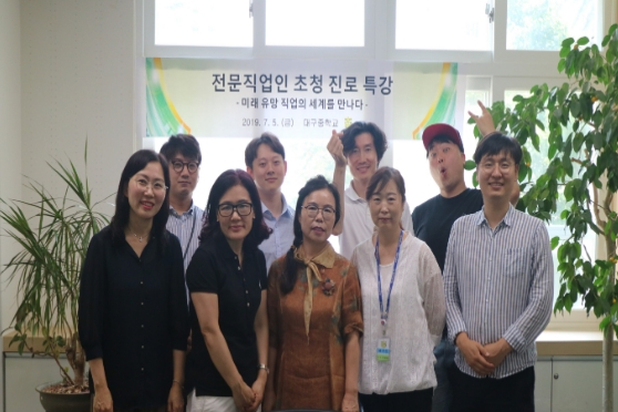 대구중학교(교장 손영자)는 지난 5일 남구 진로진학코칭센터와 미래 유망 직업 분야의 전문직업인을 초청하여 지역사회 연계 진로 특강 행사를 3학년 학생을 대상으로 실시했다. 이번 진로 특강에서 학생들은 희망 직업별로 반을 편성하여, 초청 강사들의 삶과 직업에 대한 진솔한 이야기를 들으면서 진로 탐색 과 진학 방향 등을 실질적으로 알아볼 수 있는 시간을 가졌다.진로 특강을 마친 한 학생은 “드론 조종사인 강사님께서 들려주신 경험을 통해서 막연하게만 알고 있던 드론의 활용의 분야에 대해서 알게 되었고, 진로를 위해 준비해야 할 것들을 파악할 수 있어 많은 도움이 되었다.”고 소감을 밝혔다.강사로 초청된 대구 유튜버 아카데미 박정일 대표는 “학생들이 좋아하는 것을 콘텐츠로 만드는 것이 유튜버의 시작이고 꾸준하게 지속적으로 동영상을 편집하여 올리는 과정이 중요하다.”라고 유튜버를 꿈꾸는 학생들에게 전했다.대구중 교장 손영자는 “이번 전문직업인 초청 진로 특강 행사에는 미래 유망 직업 분야의 전문직업인들이 참석하여 학생들이 미래 사회를 준비할 수 있는 데 실질적인 도움이 되었고, 앞으로도 학생들이 꿈과 희망을 실현하는 좋은 경험을 할 수 있도록 계속하여 지원하겠다.”라고 말했다.