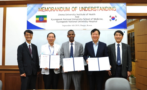경북대 의과대학·경북대병원과 에디오피아 짐마대 의과대학이 지난 4일 의학 발전을 위한 학술교류협약(MOU)을 체결했다. 이번 협약을 통해 3개 기관은 인재, 의료 기술 및 의료 인프라를 최대한 활용해 우수한 의료 인재 양성과 의학 기술 개발에 상호 공동 노력하기로 했다. 협약에 따르면 양 대학은 ▲교환학생, 교원 등 교류 프로그램의 개발 및 공동 진행 ▲현지 학교의 해외 봉사활동을 통한 교육, 기술, 물적 지원 ▲공동 연구를 통한 각 기관의 의료 정보 공유 및 연구력 향상 등에 힘을 모은다.이종명 경북대 의과대학장은 "경북대 의과대학이 아프리카 국가와 맺는 첫 번째 협약이다. 에디오피아는 아프리카 유일의 한국전쟁에 참전했던 나라다. 이번 협약으로 두 나라 간의 의료 연구 및 기술 교류와 다양한 형태로 협력할 수 있는 기반을 마련할 수 있도록 하겠다"고 말했다.