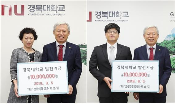 서순림 경북대 명예교수와 굳센병원 백승길 병원장이 지난 5일 김상동 경북대 총장을 방문해 대학 발전을 위해 써달라며 발전기금 1천만원을 전달했다. 서순림 명예교수가 전달한 발전기금은 '간호대학기금'으로, 백승길 병원장이 전달한 발전기금은 '정형외과학교실기금'으로 적립돼 사용될 예정이다.