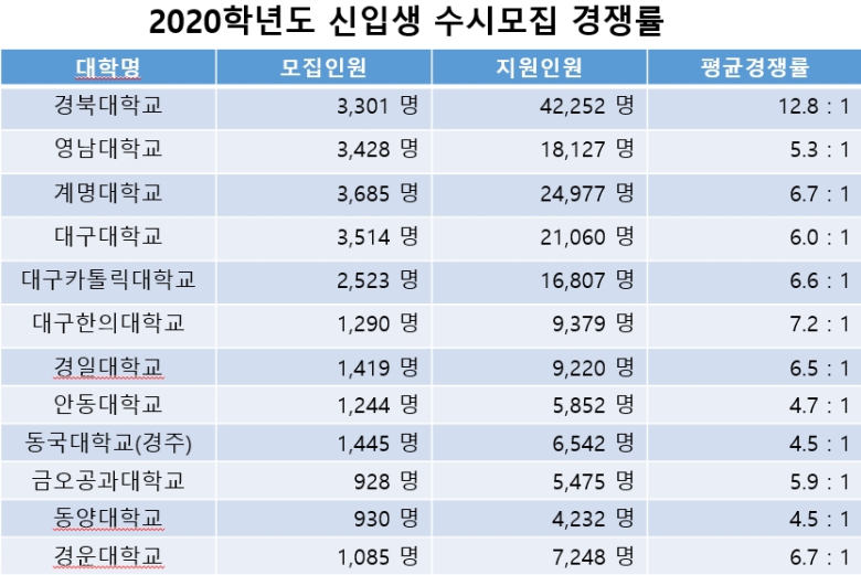 2020학년도 신입학 수시모집에서 대구·경북권 대부분 대학의 경쟁률이 전년도보다 소폭 하락한 것으로 나타났다. 경북대는 3천301명 모집에 4만2천252명이 지원해 평균 12.8대 1의 경쟁률을 보였다. 전년도 경쟁률 13.46대 1보다 낮은 수준이다.논술(AAT)전형 치의예과는 5명 모집에 955명이 지원해 191대 1로 최고 경쟁률을 기록했다. 같은 전형에서 수의예과가 14명 모집에 2595명이 지원해 185.3대1, 의예과가 20명 모집에 3101명이 지원 155대1의 경쟁률을 각각 기록했다.전형유형별로는 793명 모집에 2만1722명이 지원한 논술(AAT)전형이 27.4대 1로 가장 높았고 23명 모집에 317명이 지원한 학생부종합 사회배려자전형이 13.7대 1로 뒤를 이었다. 학생부종합전형(일반학생)은 773명 모집에 7150명이 지원해 경쟁률은 9.2대 1을 기록했다.영남대는 3,428명 모집에 1만8,127명이 지원해 경쟁률 5.3대 1을 나타냈다. 지난해 5.8대 1보다는 다소 낮았다.일반학생전형 의예과가 8명 모집에 192명이 지원해 24대 1의 경쟁률로 최고를 기록했다. 의예과의 경우, 지역인재특별전형 13.6대1, 창의인재전형 15.6대1 등 전 전형에서 높은 경쟁률을 보였다. 일반학생전형 인문자율전공학부(항공운항계열) 10.1대 1, 경찰행정학과 14.3대 1, 로봇기계공학과 12.8대 1, 유아교육과 14.0대 1 로 높은 경쟁률을 보였다.전형별로 살펴보면, 2,075명을 모집하는 일반학생전형(인문자율전공학부 항공운항계열, 군사학과 제외)에는 1만618명이 지원해 5.1대 1의 경쟁률을 기록, 680명을 선발하는 창의인재전형에는 2873명이 지원해 4.2대 1, 501명을 선발하는 잠재능력우수자전형에는 3179명이 지원해 6.4대 1의 경쟁률을 보였다.계명대는 3685명 모집에 2만4977명이 지원, 6.7대 1의 경쟁률을 보여 지난해 6.8대 1보다 소폭 하락했다.학생부종합 일반전형 의예과가 35대 1로 최고의 경쟁률을 보였으며, 경찰행정학과 24.4대 1, 사회복지학과 20.5대 1, 스포츠마케팅학과 15.8대 1의 경쟁률을 보였으며 학생부종합(지역)전형 유아교육과 22대 1, 건축학전공(5년제)이 20.3대 1, 심리학과가 18.4대 1의 경쟁률을 기록했다. 학생부교과 일반전형 공중보건학전공 17.3대 1, 전자공학전공 13.1대 1의 경쟁률을 나타냈다. 학생부교과 지역전형 소비자정보학과 29.2대 1, 기계공학전공 16.5대 1, 식품영양학전공 14.3대 1의 경쟁률을 보였다. 대구대는 3천514명 모집에 2만1천60명이 지원해 6대 1의 경쟁률을 보였다. 전년도 7.08대 1보다 하락했다.학생부종합 고른기회전형 간호학과 29대 1, 사회복지학과 19대 1, 예체능 실기전형 영상애니메이션디자인학전공이 15.8대 1, 학생부종합 서류전형 미디어커뮤니케이션학과 15.4대 1, 물리치료학과 15.2대 1 등 이다.대구가톨릭대는 2,523명 모집에 1만6천807명이 지원해 6.6대 1의 경쟁률을 기록했다. 학생부종합 DCU인재전형 간호학과가 10명 모집에 532명이 지원해 53.20대 1의 가장 높은 경쟁률을 보였다. 물리치료학과 22.4 1, 사회복지학과 16.6대 1, 심리학과 14대 1의 경쟁률을 나타냈다. 학생부교과 교과우수자전형 가족상담복지학과 23대 1, 방사선학과 22.3대 1, 물리치료학과 15.8대 1을 기록했다.