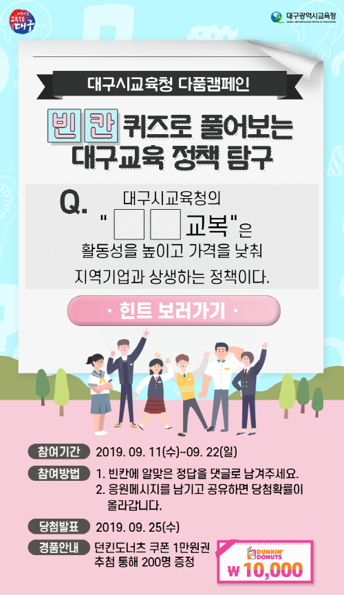 대구시교육청은 지난 11일부터 12일간 시교육청 SNS 7개 채널을 연계한 블로그를 통해 대구교육정책을 탐구하며 이해하는 '다품캠페인' 이벤트를 진행한다.시교육청에 따르면 ‘다품캠페인’은 착한교복과 국제바칼로레아(IB), 공간혁신사업, 수능응원메시지 등 대구교육의 주요 정책을 홍보하며 시민들의 관심과 참여를 높이기 위해 연말까지 4회에 걸쳐 마련한 행사다. ‘착한 교복’을 주제로 첫 번째 열리는 이번 이벤트는 대구시민이라면 누구나 참여할 수 있고 ‘대구시교육청 블로그’에 게시된 빈칸퀴즈에 댓글로 정답과 응원메시지를 남기면 정답자 중 추첨을 통해 200명에게 소정의 온라인상품권을 증정한다. 이벤트 행사 내용은 대구시교육청 홈페이지와 SNS 공식채널(블로그, 페이스북, 인스타그램, 카카오스토리, 카카오톡 플러스친구)에서 확인할 수 있다.