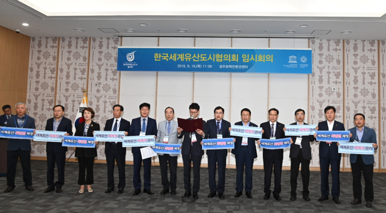 세계유산도시기구 이사도시인 경주시를 비롯한 한국세계유산도시협의회 17개 회원도시 단체장들이 지난 19일 경주 화백컨벤션센터에서 임시회의를 열고 '세계유산특별법' 제정을 촉구했다.