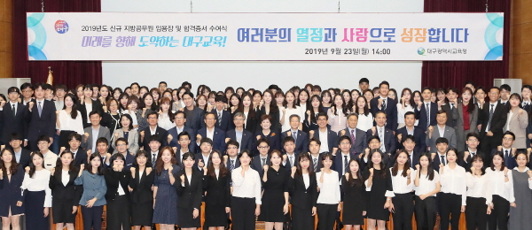 대구시교육청(교육감 강은희)은 23일 시교육청 행복관서 '2019년도 신규 일반직공무원 임용장 및 합격증서 수여식'을 개최했다고 밝혔다.