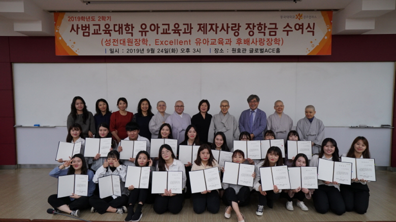 동국대학교 경주캠퍼스 사범교육대학 유아교육과 제자사랑 장학금 수여식이 24일 교내 원효관 글로벌 에이스홀에서 열렸다.이날 수여식에서는 평소 불심이 돈독하고 학업 성적이 우수한 재학생 21명을 장학생으로 선발해, 성전대원장학생 2명, 엑설런트 장학생 19명에게 총 2300만 원의 장학금을 전달했다. 성전대원장학회(이사장 대원스님)는 지난 2008년부터 동국대 유아교육과 교수 대원스님이 유아교육과 경쟁력 강화와 미래 우수교사 양성을 위해 출연하기 시작한 장학회로, 이번 수여식을 포함하여 총 168명의 학생에게 장학금을 수여 했다. 엑설런트 유아교육과 후배사랑장학회는 유아교육과 졸업 동문들이 2012년 유아교육과 설립 10주년을 기념하여 후배들을 사랑하는 마음으로 1억 원을 약정하여 만든 장학회이다. 지금까지 153명의 학생에게 장학금을 전달했다. 성전대원장학회 이사장 대원스님(유아교육과 교수)은 “대학에 재직하면서 받았던 것을 여러분에게 돌려주고 싶다. 정년퇴직하기 전에 유아교육과 전 학생들에게 장학금을 주고 싶다”고 격려했다.