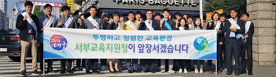 이날 서부교육지청 직원 30명은 '친절은 마음으로 청렴은 행동으로' 문구가 새겨진 청렴 어깨띠를 착용하고, 출근하는 지역민에게 청렴 홍보물을 배부했다.