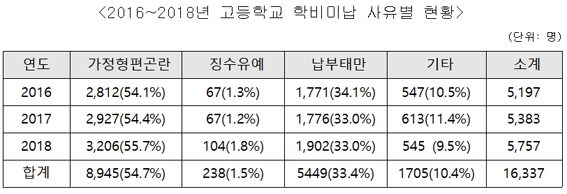 학비를 미납한 가장 큰 원인은 가정형편 곤란(54.7%)이었다. 그 인원도 2016년 2812명(54.1%), 2017년 2927명(54.4%), 2018년 3206명(55.7%)으로 지속적으로 증가했다. 그 다음으로는 납부 태만(33.4%), 기타(10.4%), 징수유예(1.5%) 순이었다.