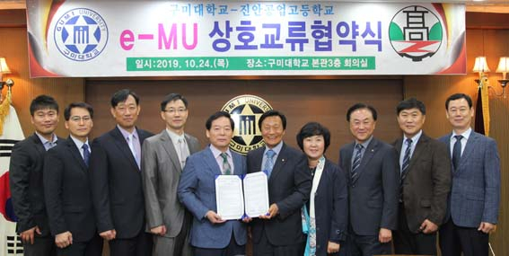 구미대학교(총장 정창주)가 24일 본관 3층 회의실에서 전라북도 진안공업고등학교(교장 신동신)와 e-MU 전문인력 양성을 위한 상호교류 협약(MOU)을 체결했다고 밝혔다.