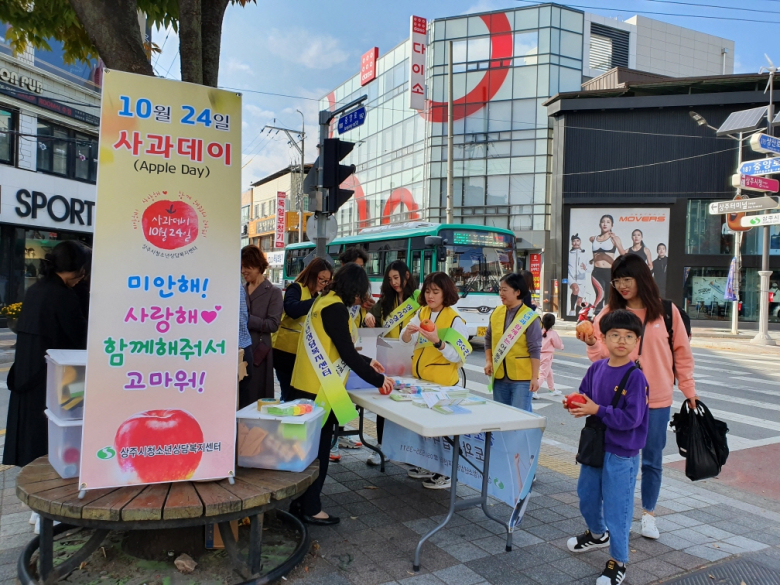 상주시청소년상담복지센터는 사과 데이(Apple Day)인 지난 24일 오후3시 상주서문사거리에서 '미안해! 사랑해♡ 함께 해줘서 고마워!'라는 슬로건으로 사과나누기 캠페인을 실시했다.