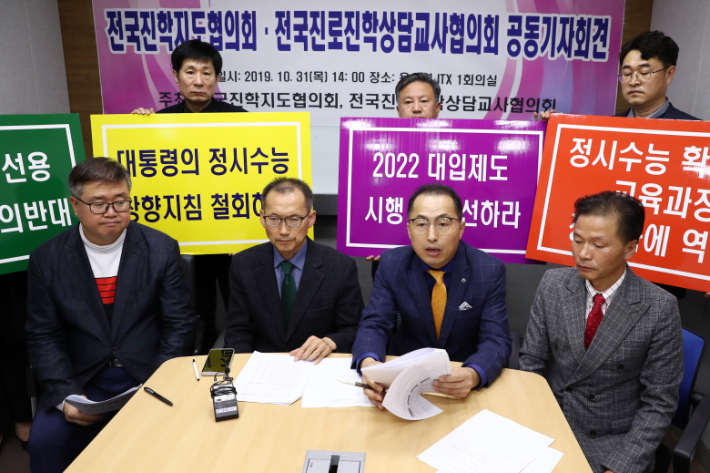 전국진학지도협의회와 전국진로진학상담교사협의회는 이날 오후 서울 용산역 회의실에서 기자회견을 열고 "대통령의 시정연설은 대선 공약과 1호 교육정책이었던 고교학점제를 부정하며 정시 확대를 사실상 강제하고 있다"며 "이런 상황이라면 2025년부터 고교학점제를 전면 시행하겠다고 교육부가 아무리 강조를 해도 현장 교사들은 정부를 신뢰하기 어렵다"고 주장했다.